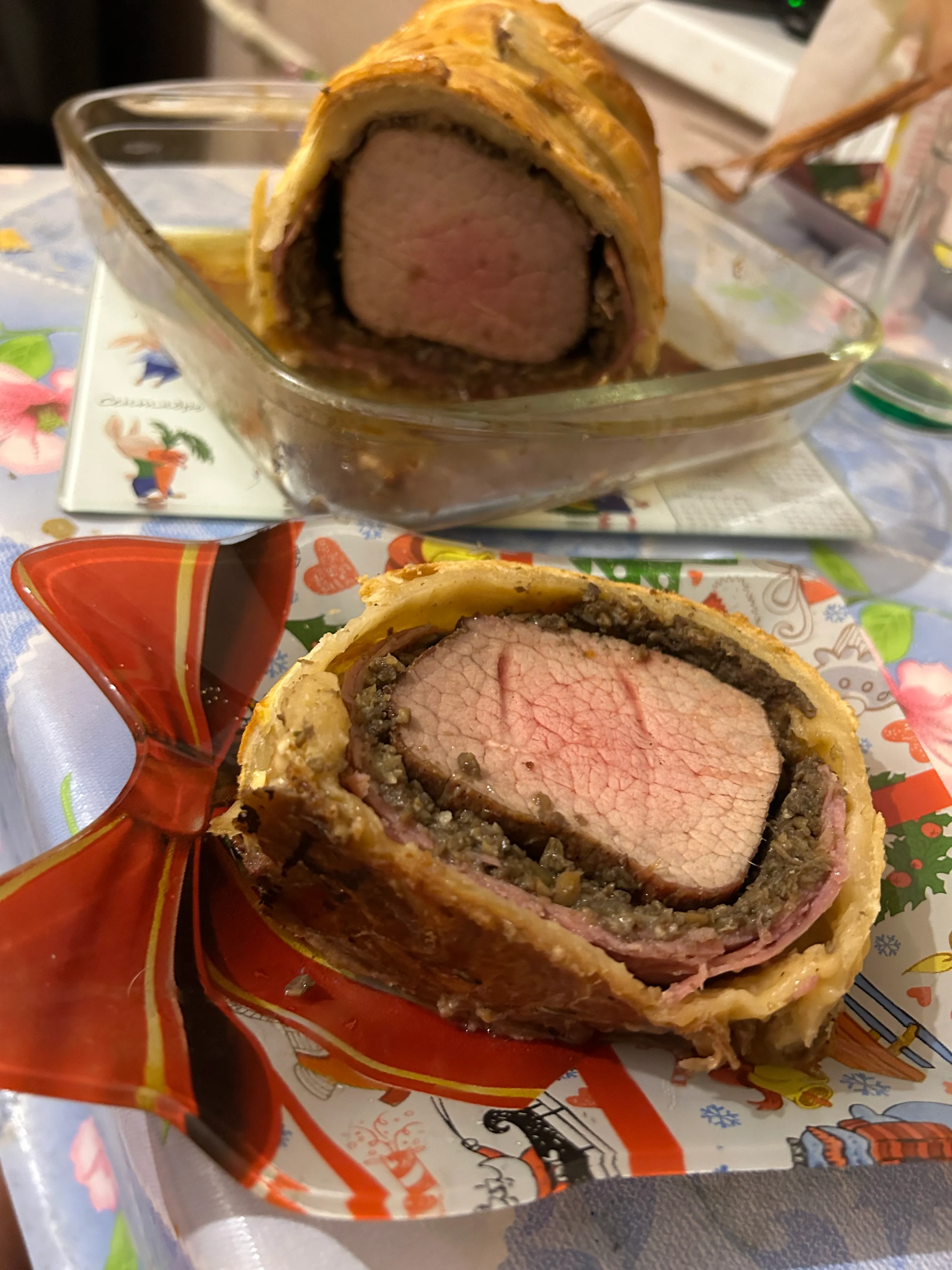 Для степени готовности «медиум» запекайте мясо 15 минут при температуре 200 °C и 15 минут при температуре 180 °C. Оставьте говядину в слоеном тесте «отдохнуть» 15-20 минут, сверху прикрыв фольгой и полотенцем. Нарежьте рулет и подавайте.