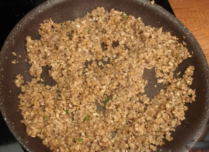 На масле, оставшемся после обжарки говядины, обжарьте сначала лук до прозрачности. Потом добавьте грибы. Выпарите всю жидкость и обжарьте шампиньоны до румяности. Добавьте соль, черный перец и тимьян по вкусу. Снимите со сковороды и дайте полностью остыть.