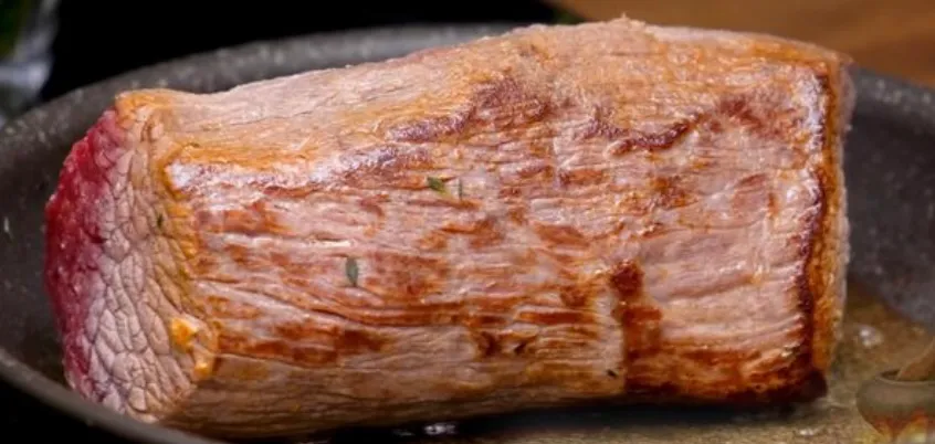 Говядину обжарьте со всех сторон (и с торцов тоже) по минуте-полторы с каждой стороны, до румяной корочки. На этом этапе нам нужно задать корочку и запечатать все соки внутри мяса. Внутри мясо остается сырым и будет еще готовиться в духовке.