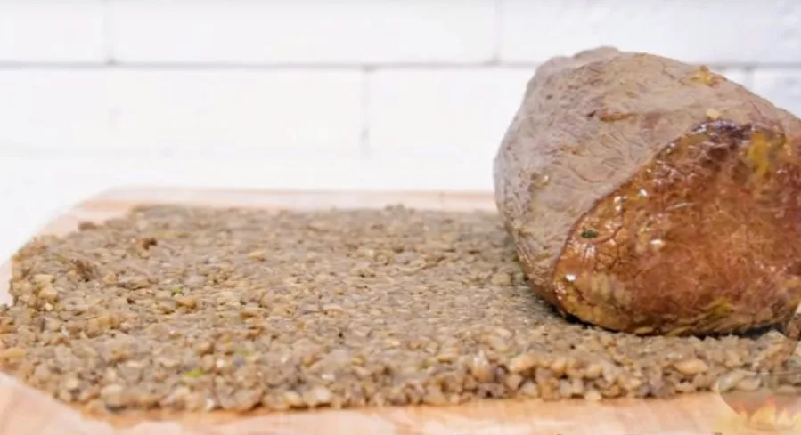 На пищевую пленку выложите полоски бекона. Сверху выложите дюксель. Переложите мясо на грибы и при помощи пищевой пленки заверните говяжью вырезку в бекон.