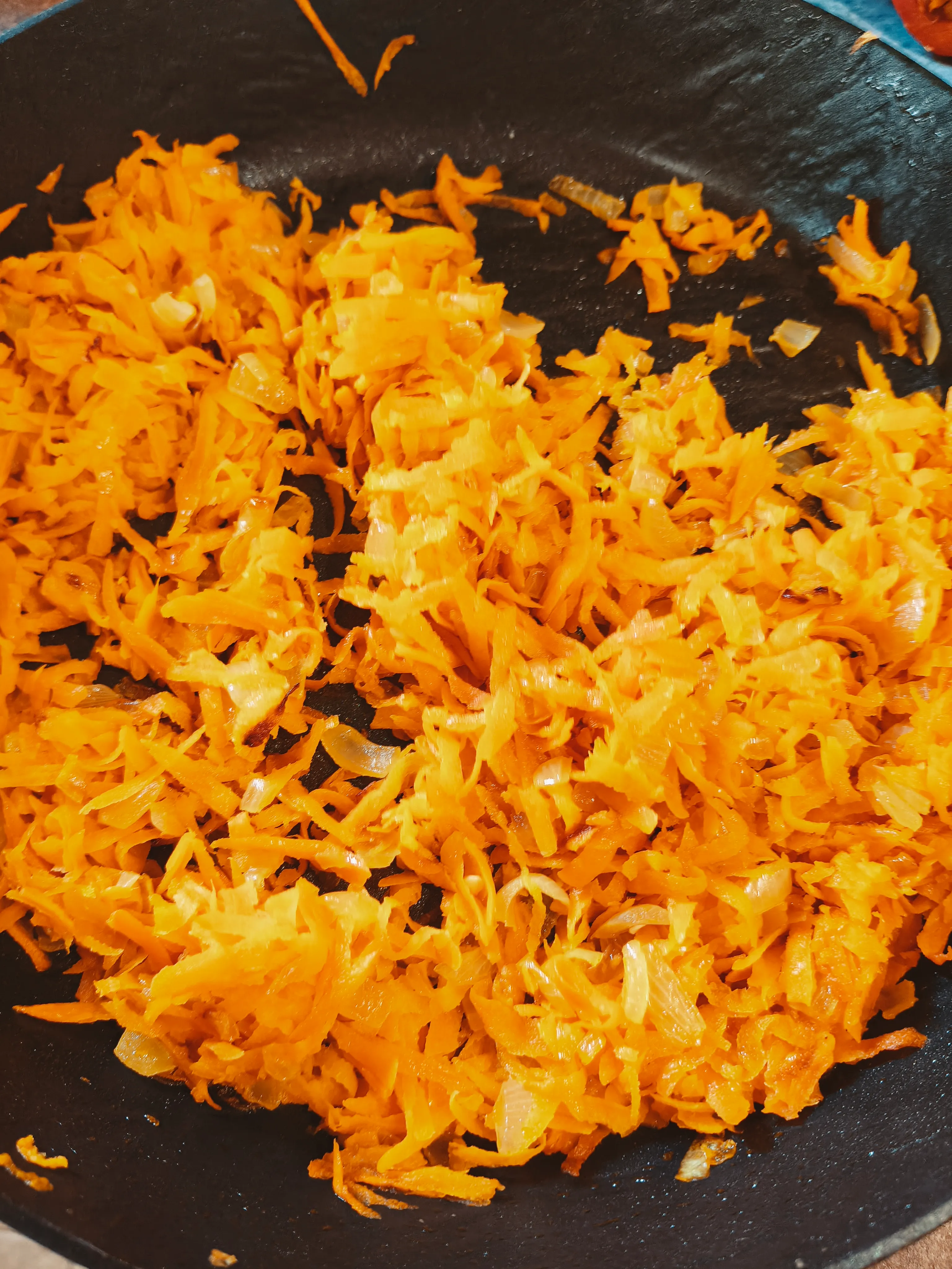 Очистите и нарежьте лук кубиками, обжарьте на растительном масле, добавьте натертую на крупной терке морковь. Посолите и добавьте сахар по вкусу. Тушите 5 минут.
