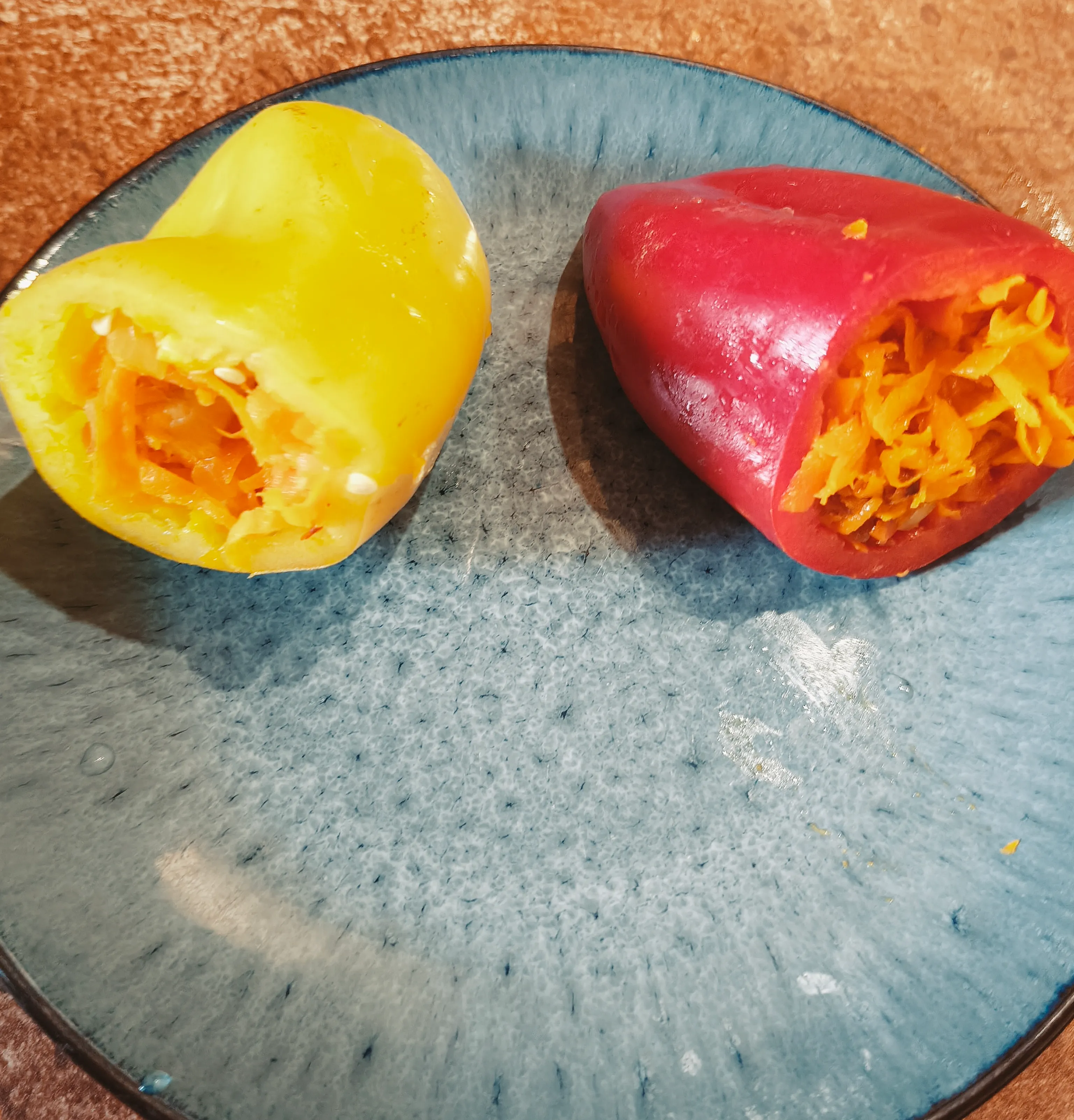 Болгарский перец аккуратно очистите от семечек и перегородок. Начините «стаканчики» тушеной морковью.