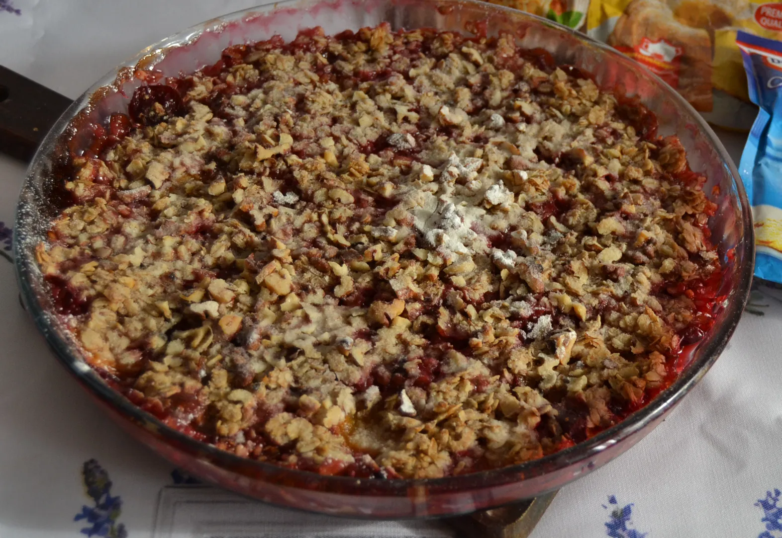 Выпекайте в духовке до образования румяного цвета (минут 40-50). Готовый крамбл сверху посыпьте сахарной пудрой.