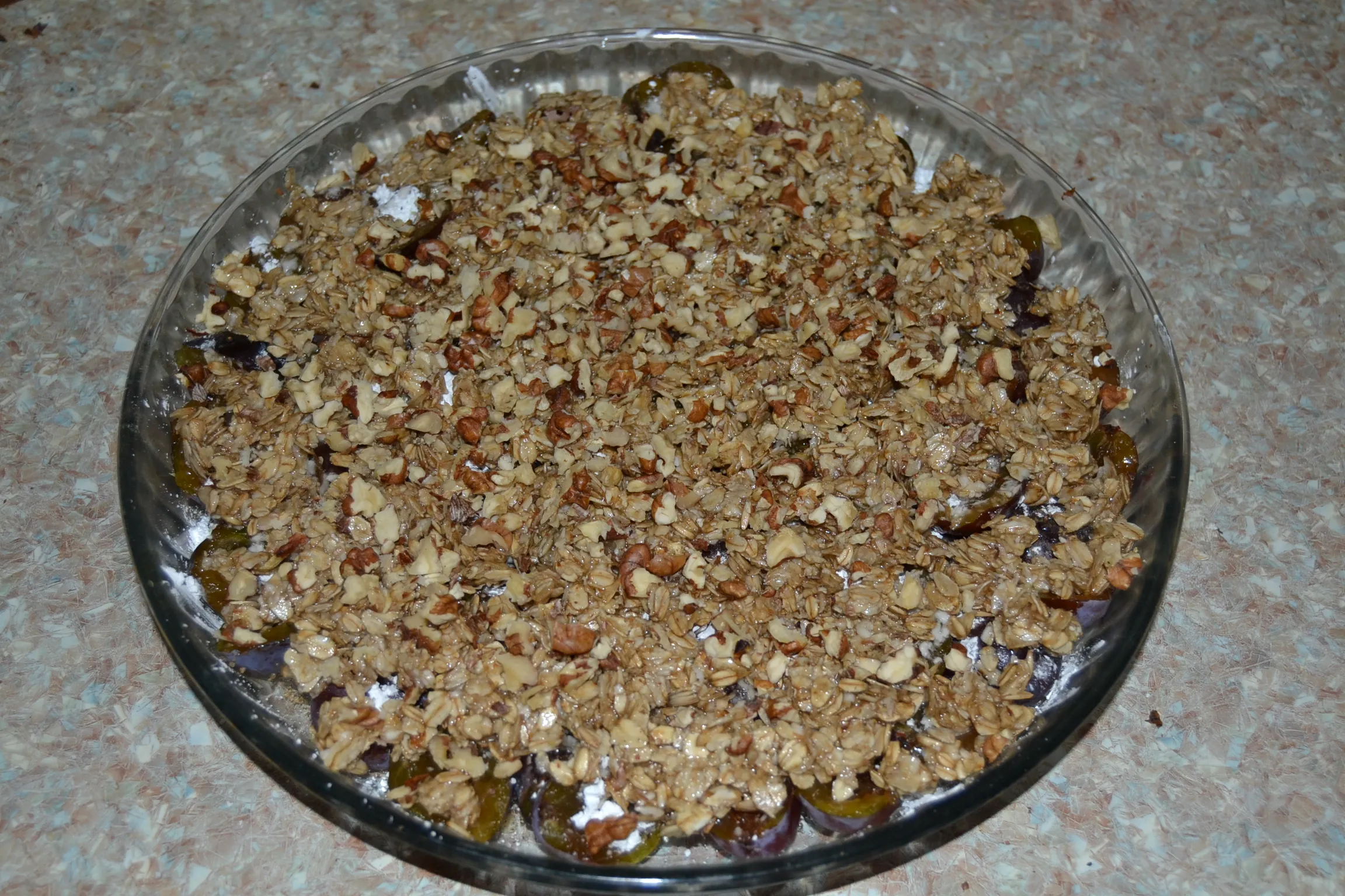 Смешайте овсяные хлопья, мед и растительное масло. Грецкие орехи измельчите до крупной крошки. Выложите овсяную смесь поверх слив, грецкие орехи рассыпьте сверху.