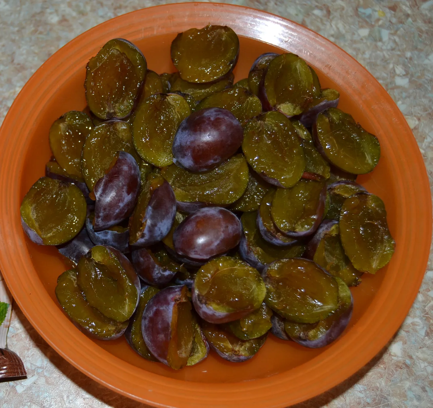 Разложите сливы в стеклянную форму, сверху присыпьте крахмалом.