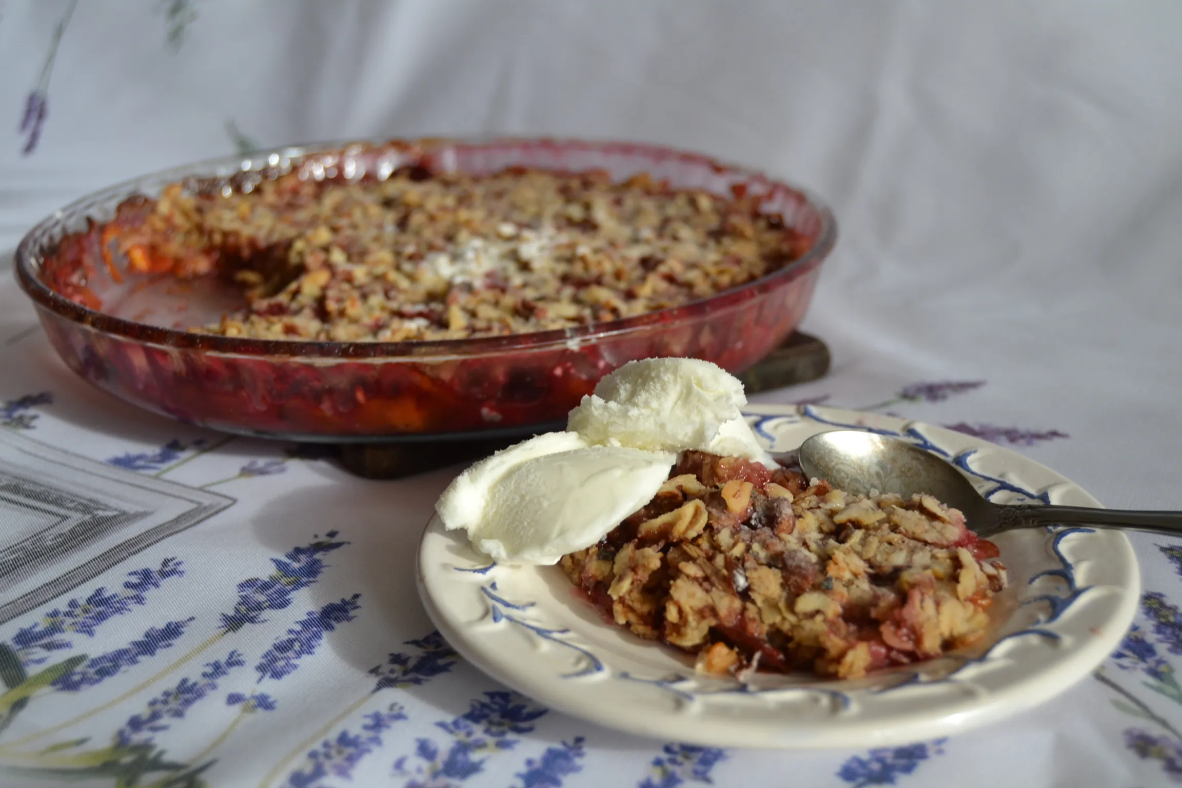 Подать сливовый крамбл можно с шариком мороженого, чтобы создать контраст между мягким мороженым и хрустящей «печенькой».
