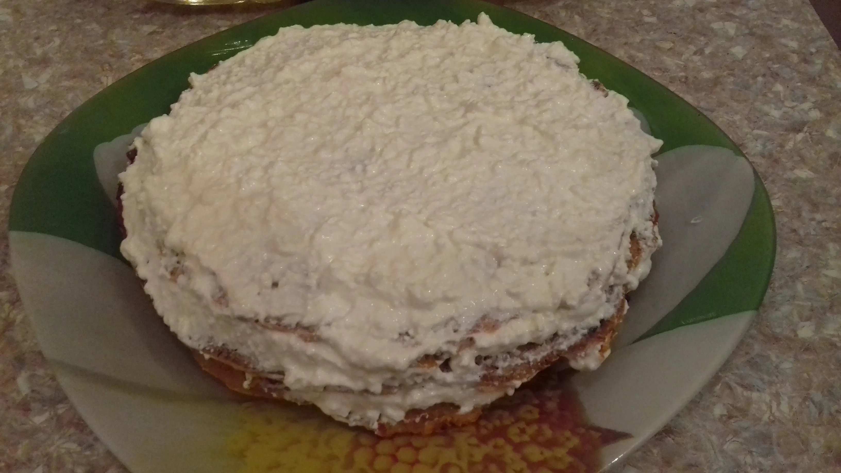 Соберите тортик: каждый корж смажьте кремом, закончите слоем крема.