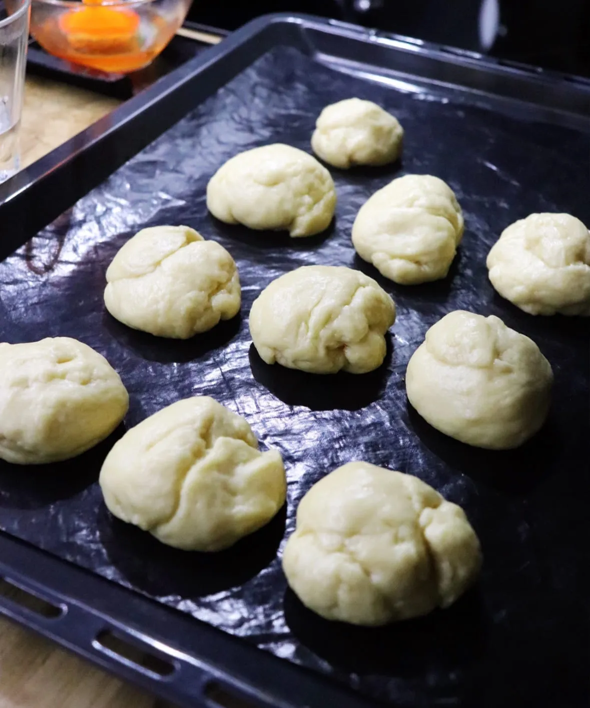 Разделите тесто на кусочки по 60 г, каждый округлите в шар без использования муки (чтобы тесто не подсохло).