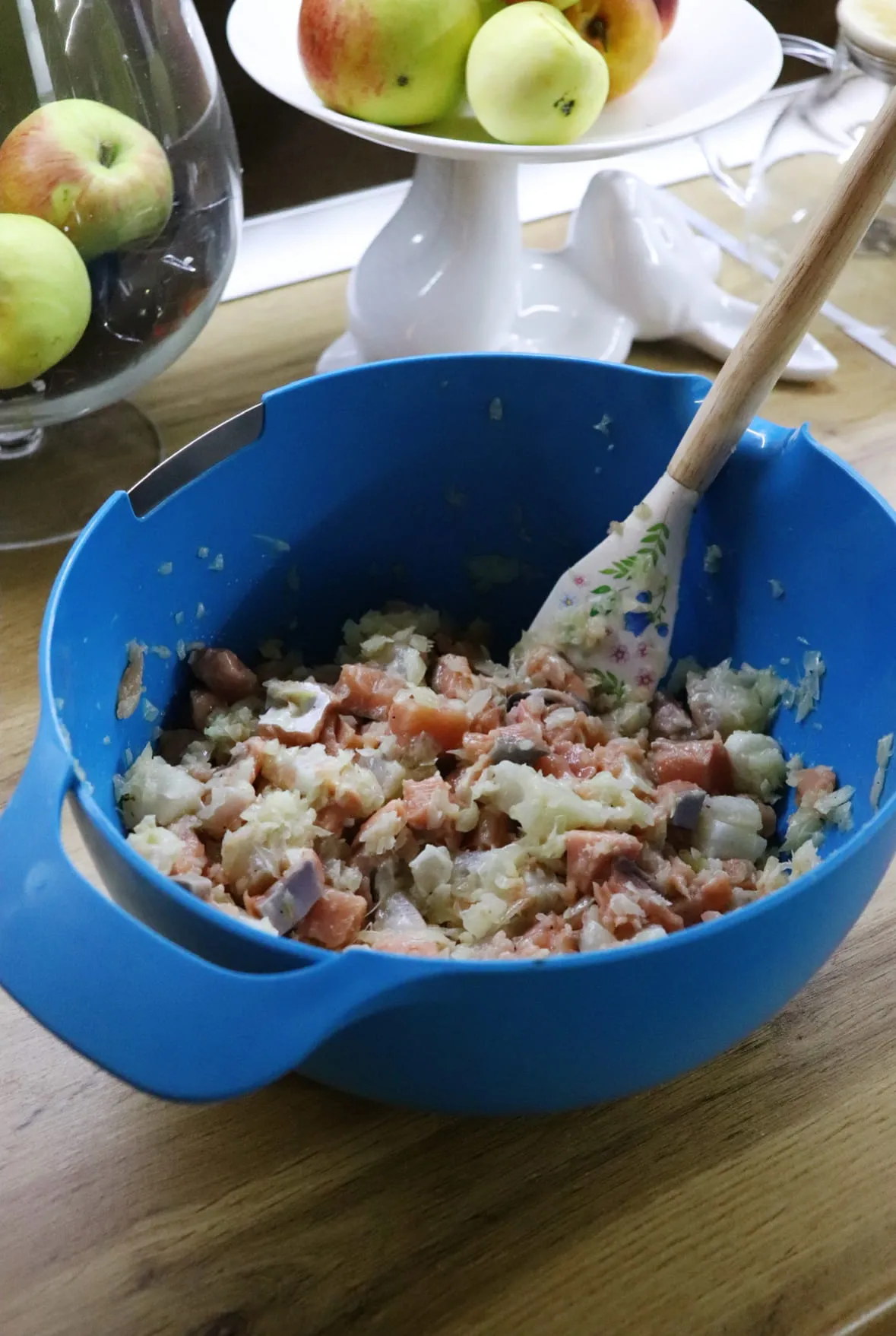 Рыбу очистите от кожи и костей, нарежьте небольшими кубиками. Соедините рыбу и лук, перемешайте, приправьте солью и свежемолотым черным перцем. Накройте пленкой и уберите в холодильник до момента формирования расстегаев.