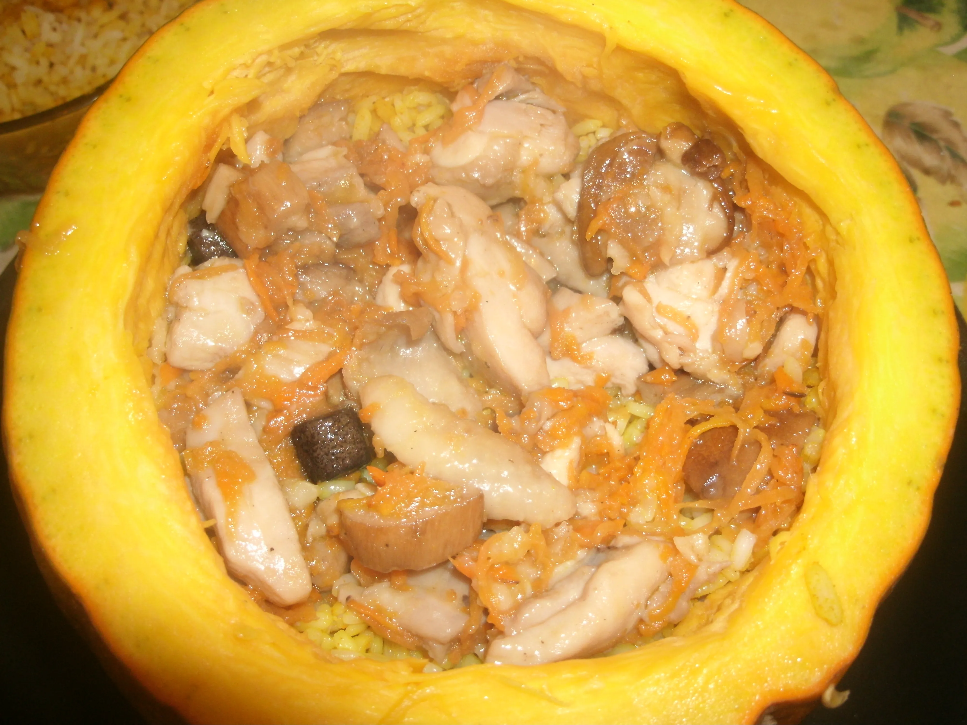 Теперь начините тыкву, чередуя рис и курино-грибную «поджарку». Верхним слоем должен быть рис.