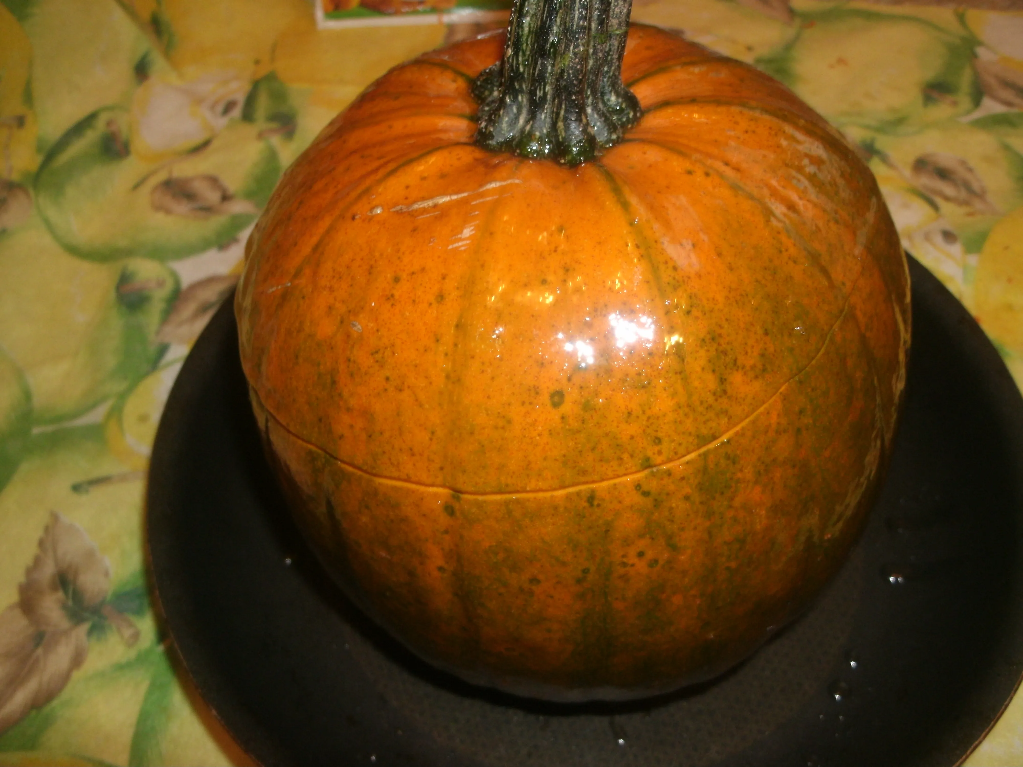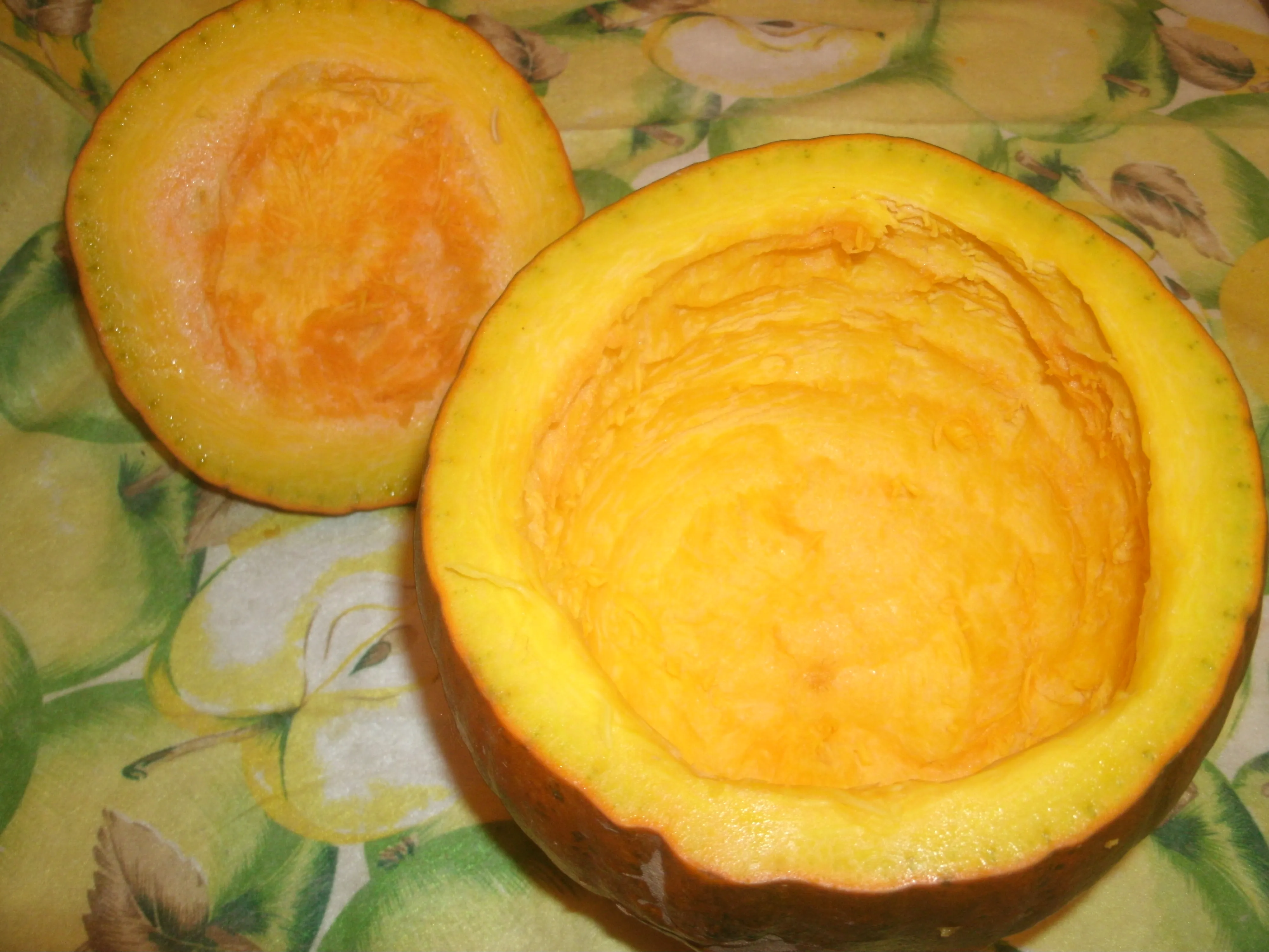 Для начала отрежьте у тыквы верхушку — это будет «крышечка» нашего «горшочка». Внутренности удалите: семена вычистите, выскоблите мякоть так, чтобы стенки остались толщиной 1-1,5 см. Промажьте «горшочек» изнутри растительным маслом.