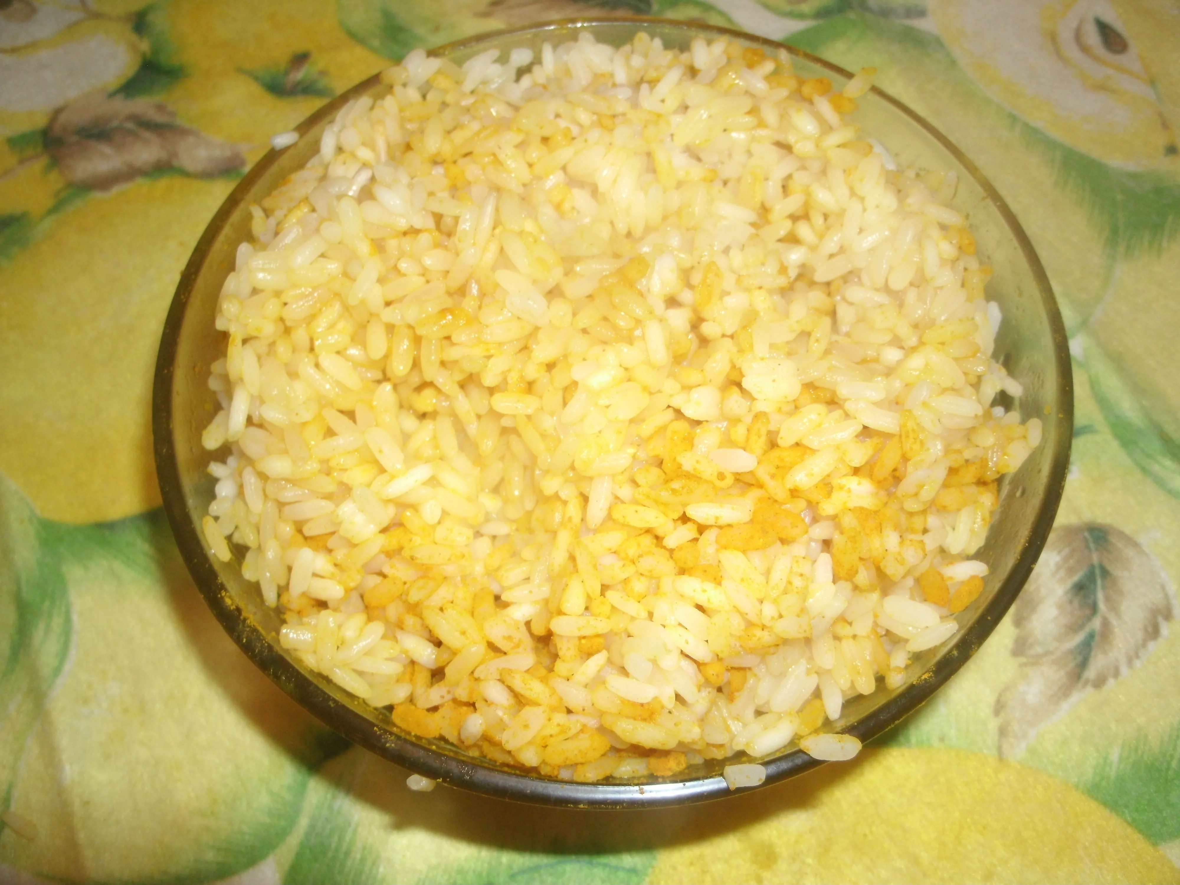 Рис отварите в подсоленной воде до полуготовности, промойте и добавьте 0,5 чайной ложки куркумы, чтобы крупа приобрела желтый цвет.