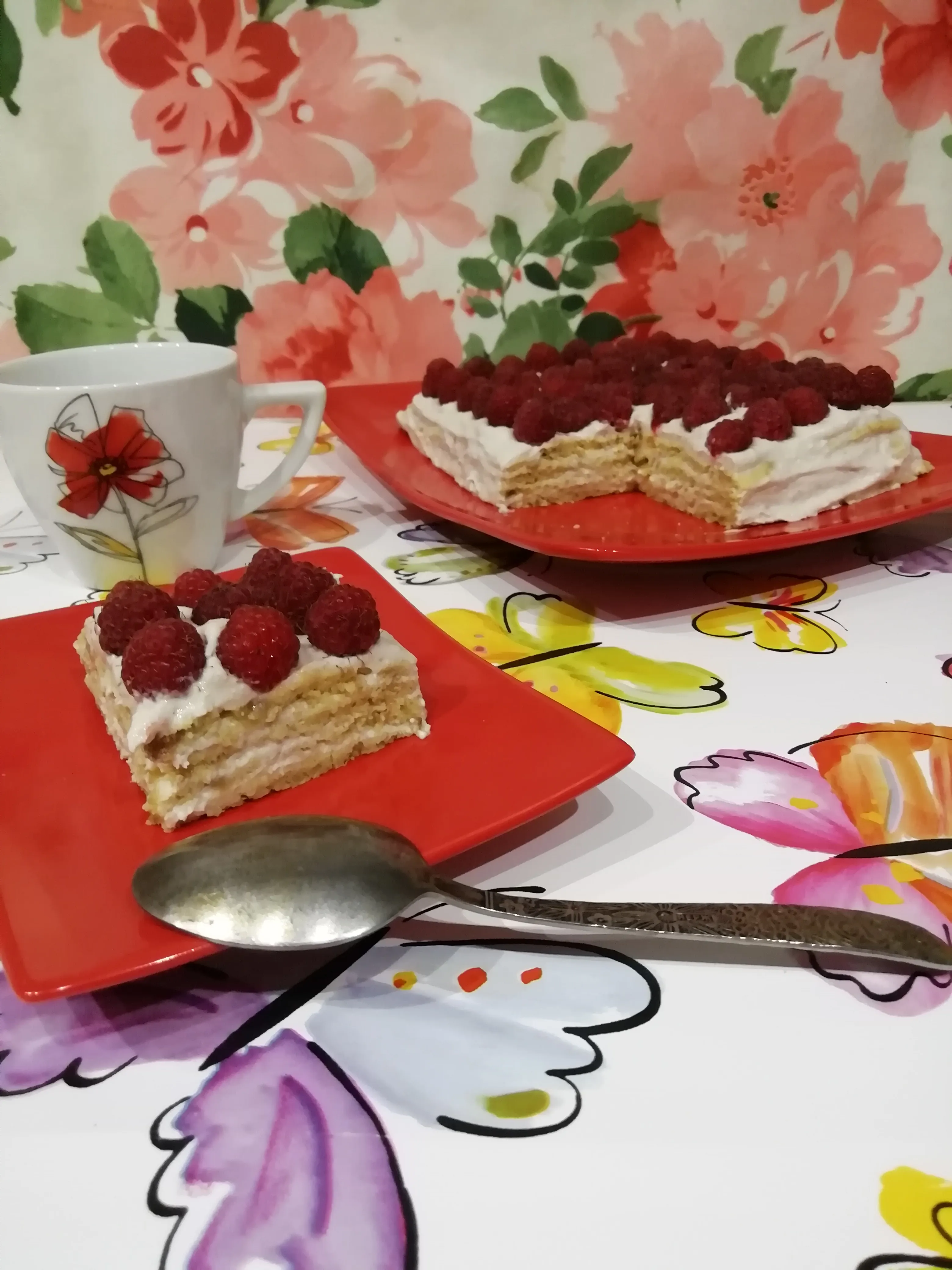 Дайте коржу остыть, снимите пергамент, разрежьте корж на несколько частей (4-6).
