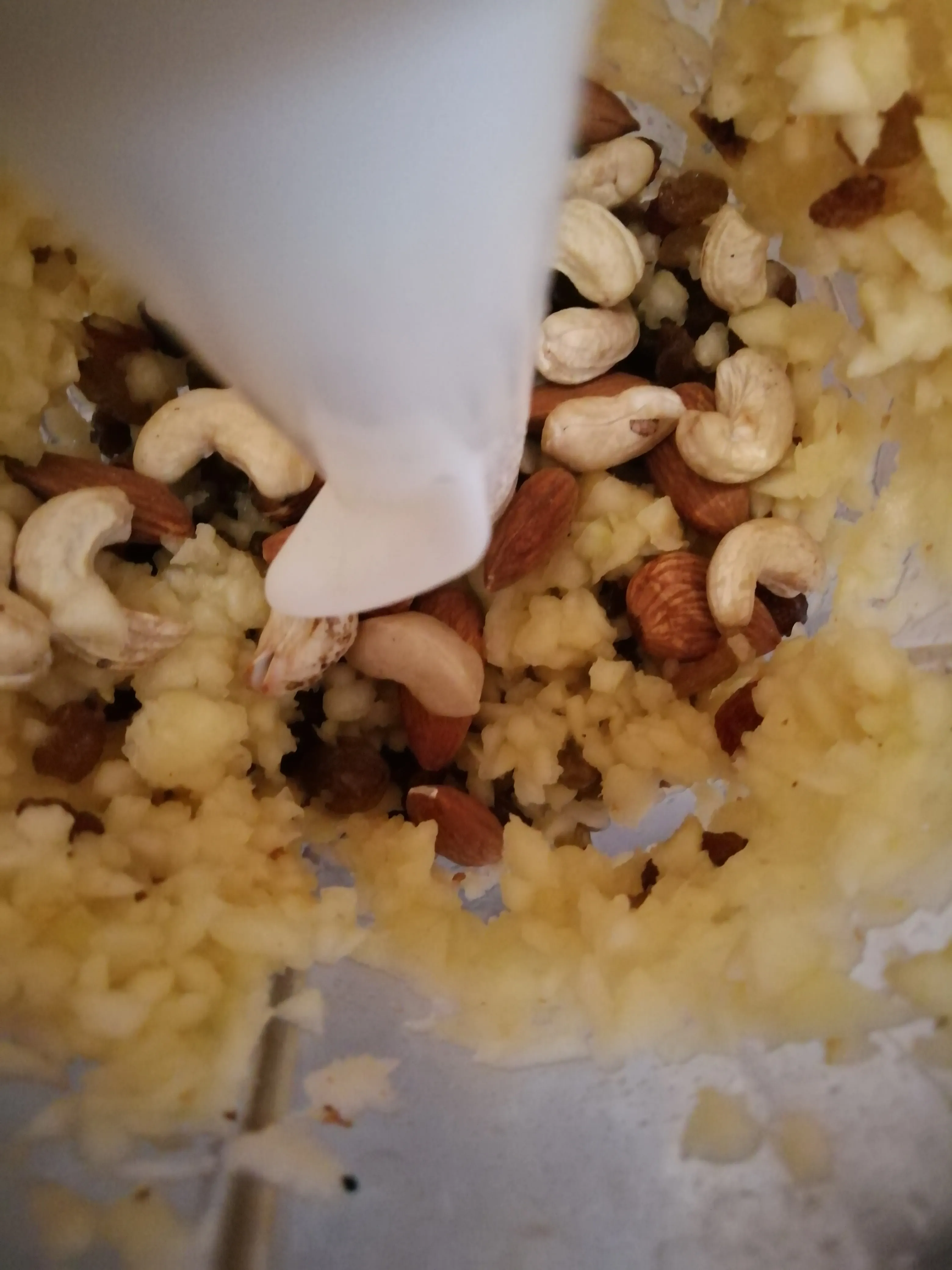 Яблоки почистите от кожуры и сердцевин, вместе с изюмом измельчите в кашицу в блендере. Добавьте орехи, тоже измельчите их в блендере с яблочно-изюмной смесью.