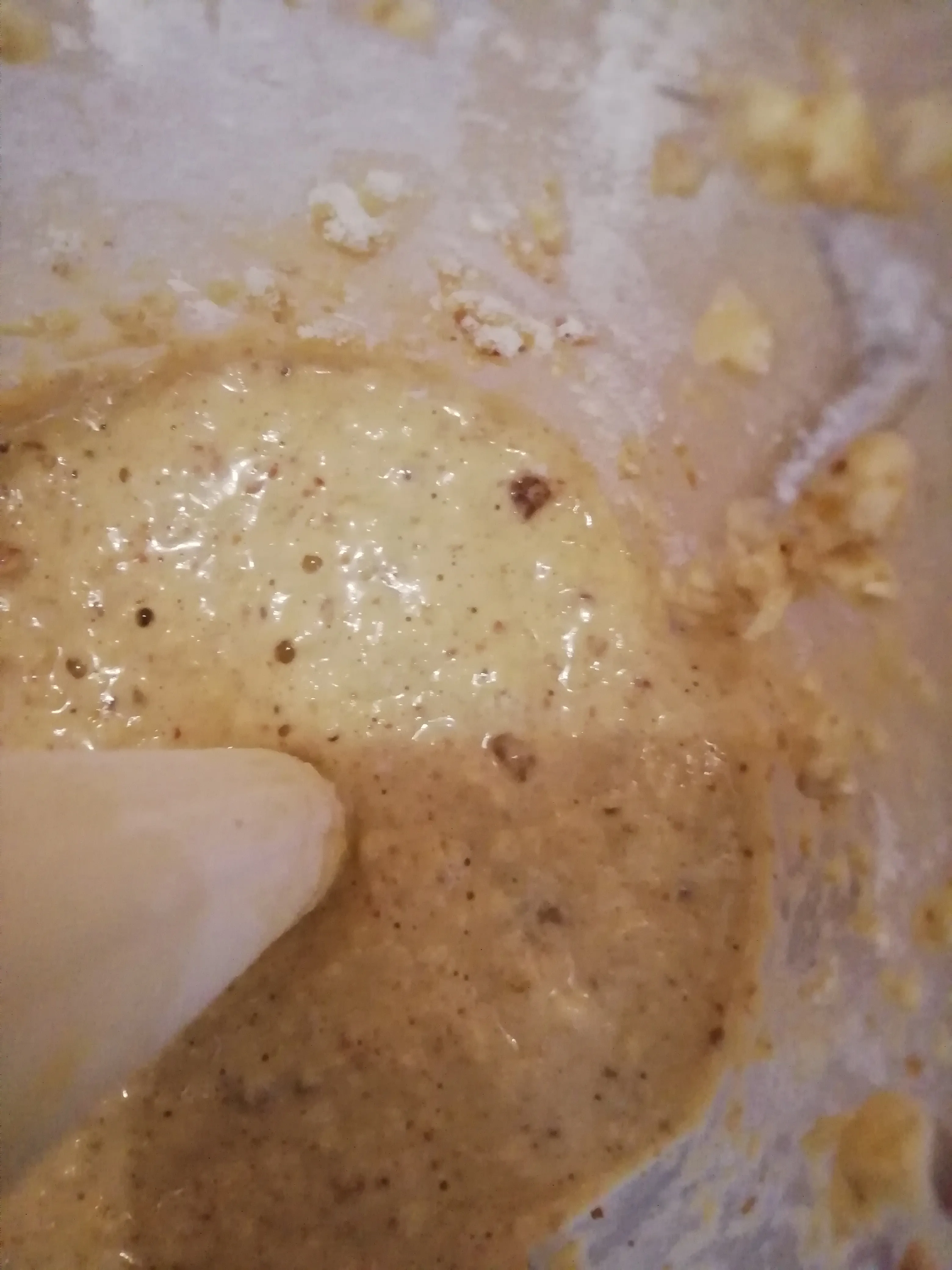 Добавьте яйца, муку, разрыхлитель и размешайте до однородной массы.