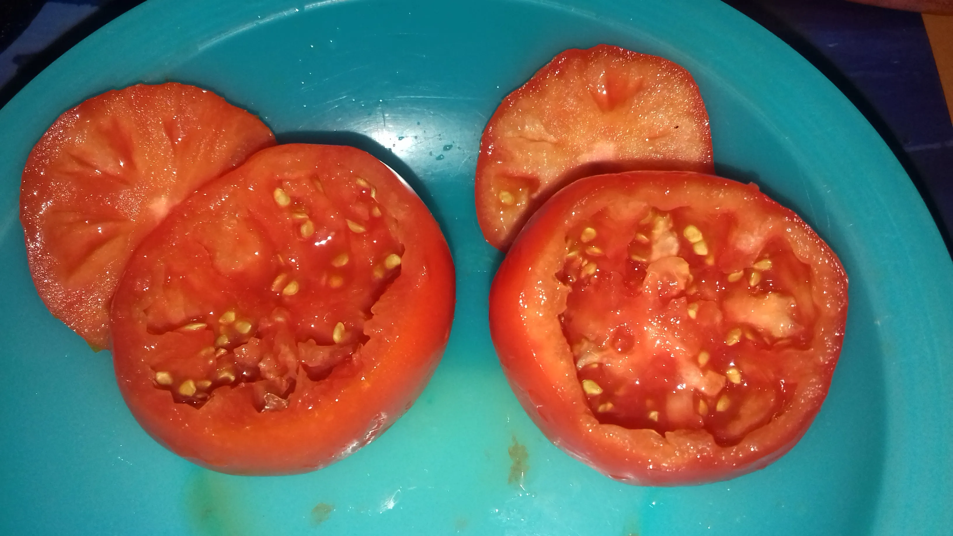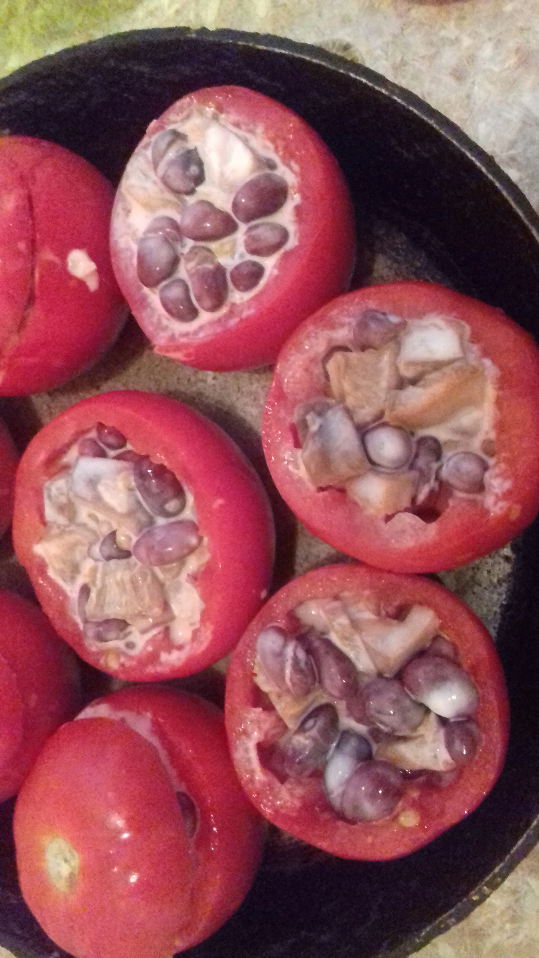 Срежьте с помидоров верхнюю часть — это будет «крышечка». Выньте из помидоров сердцевину и жидкость с семенами (делайте это осторожно, чтобы не повредить стеночки).