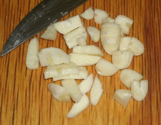 Чеснок нарежьте мелкими кусочками, обжарьте на растительном масле в течение 2-3 минут.