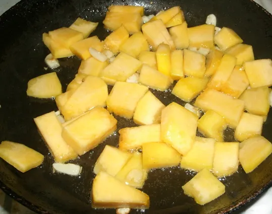 Тыкву нарежьте небольшими кусочками, добавьте на сковороду, где жарится чеснок, посолите по вкусу, размешайте и обжаривайте в течение 5 минут.