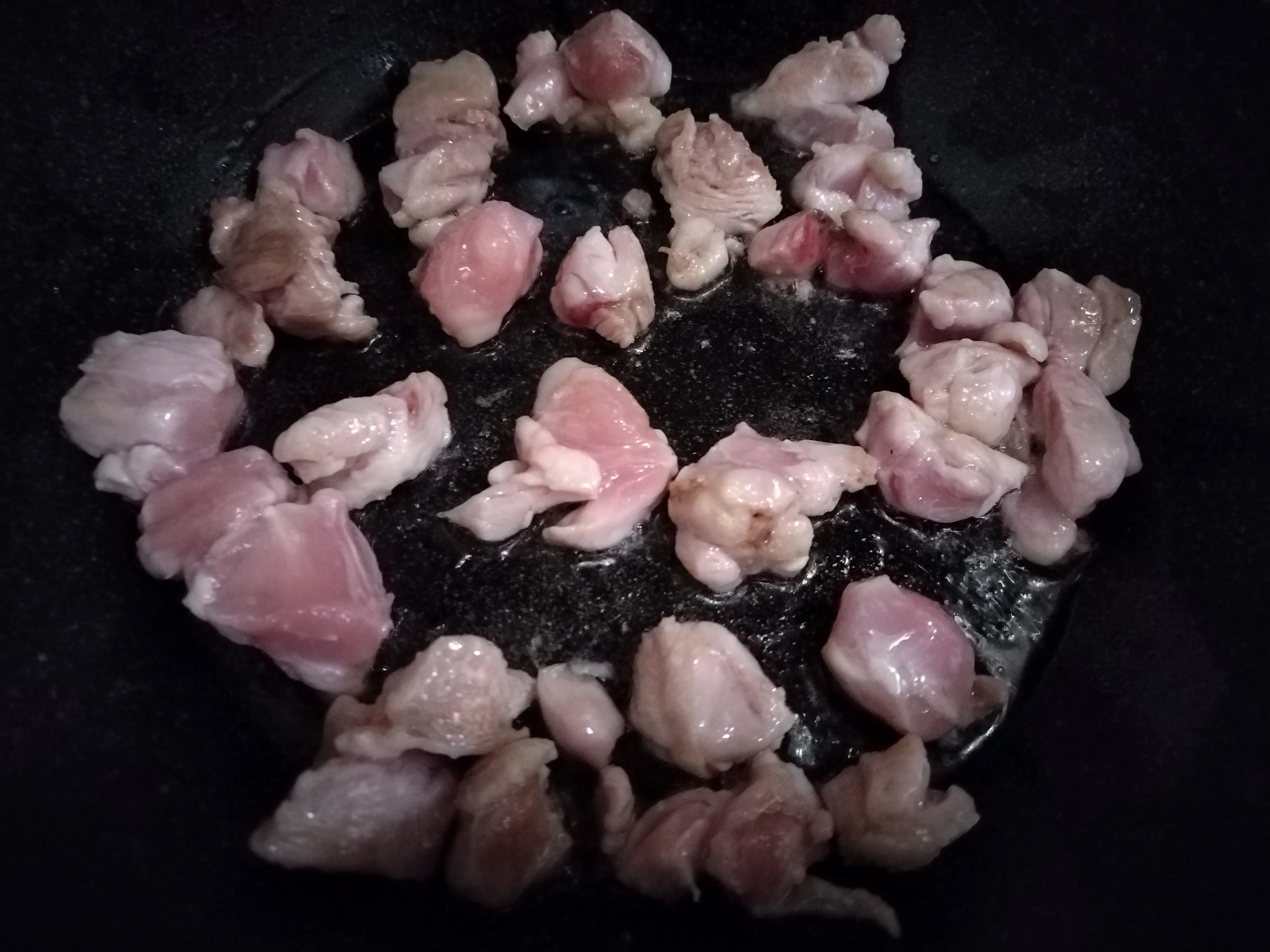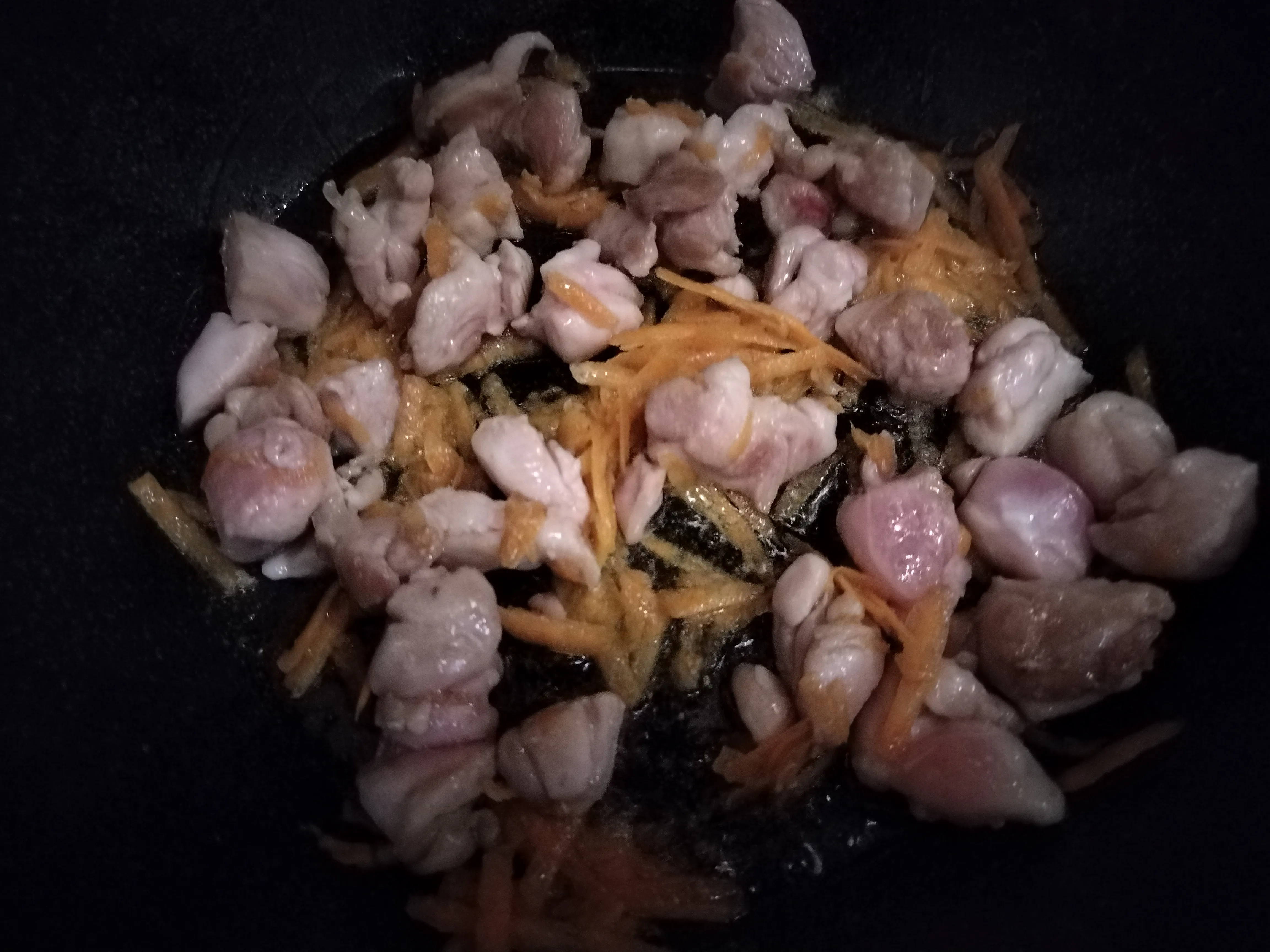 Куриное филе нарежьте кусочками, обжарьте на растительном масле до исчезновения красного цвета. Посолите, добавьте специи.
