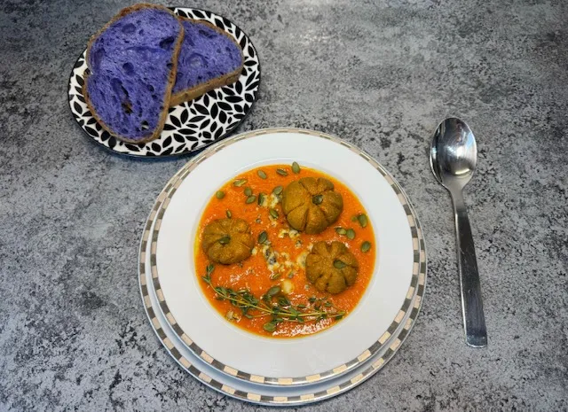 Разлейте суп по тарелкам, украсьте ньокками, тимьяном, горгонзолой и семечками тыквы. Подрумяньте лавандовый хлеб на сухой сковороде.