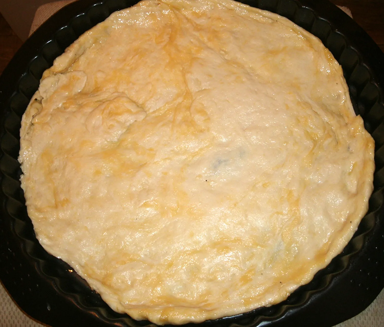 Тесто тонким слоем растяните в круглой форме.