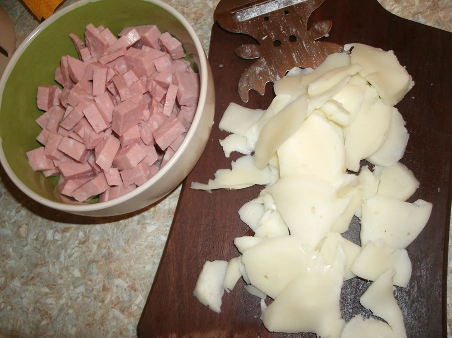 Вареную колбасу нарежьте мелкими кубиками, сыр — пластинками (лучше сделать это сырорезкой).