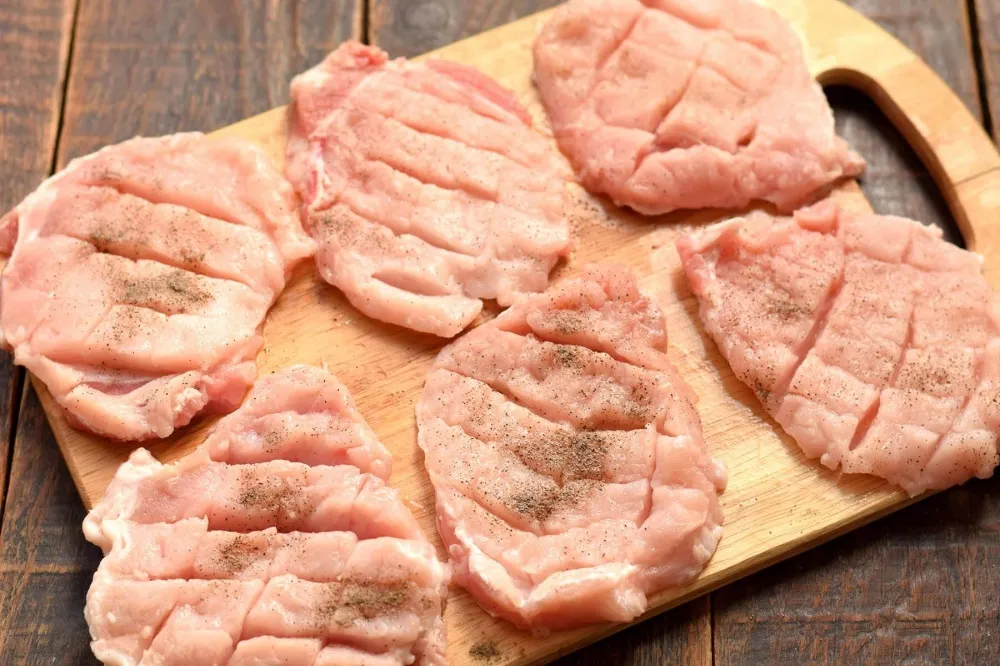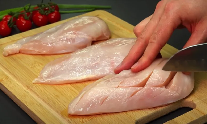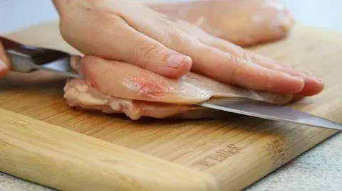 Каждое филе разрежьте вдоль, чтобы получилось два широких плоских куска.