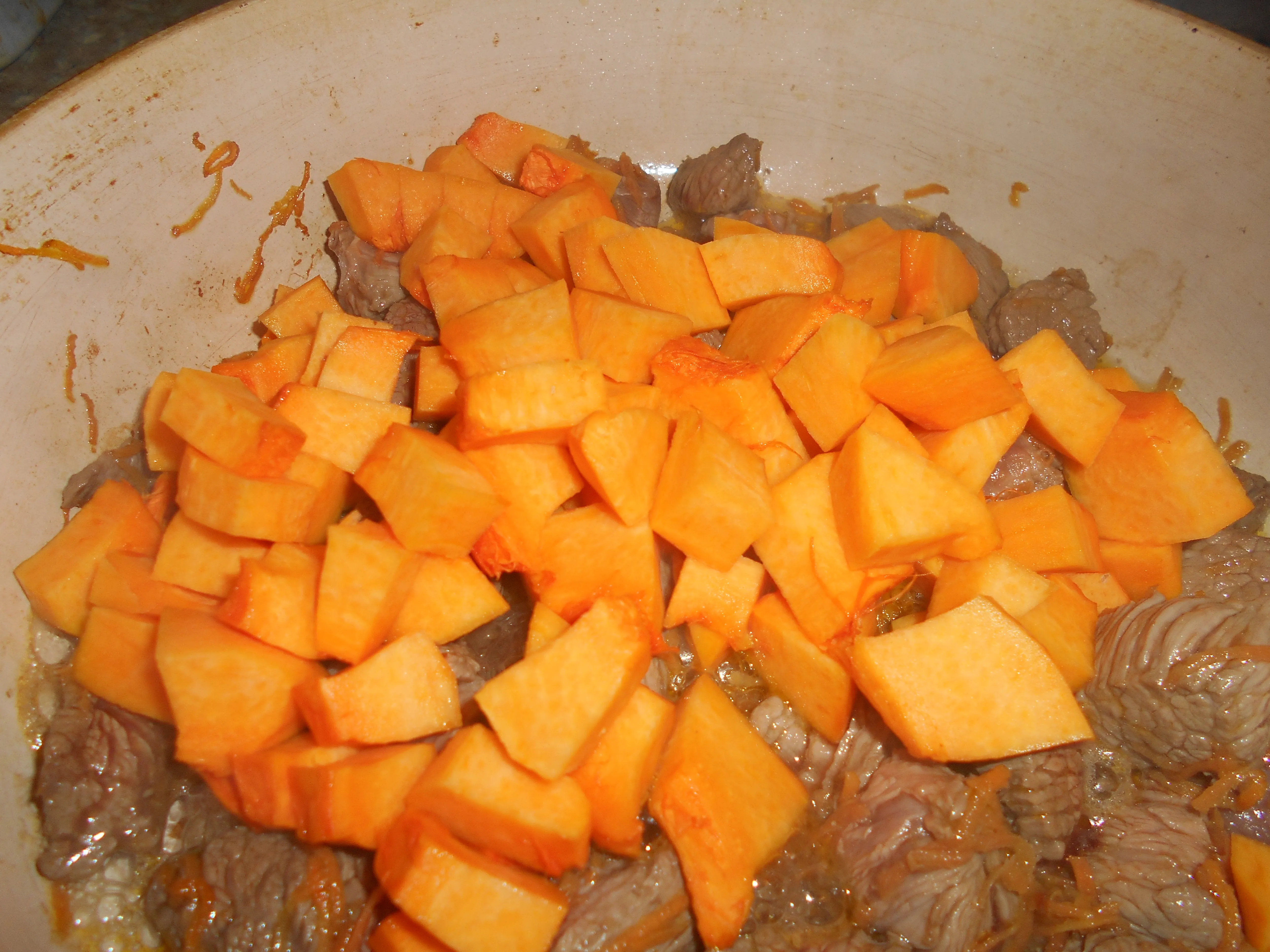 Затем добавьте тыкву, очищенную от кожицы и семян и нарезанную кубиками, обжарьте.