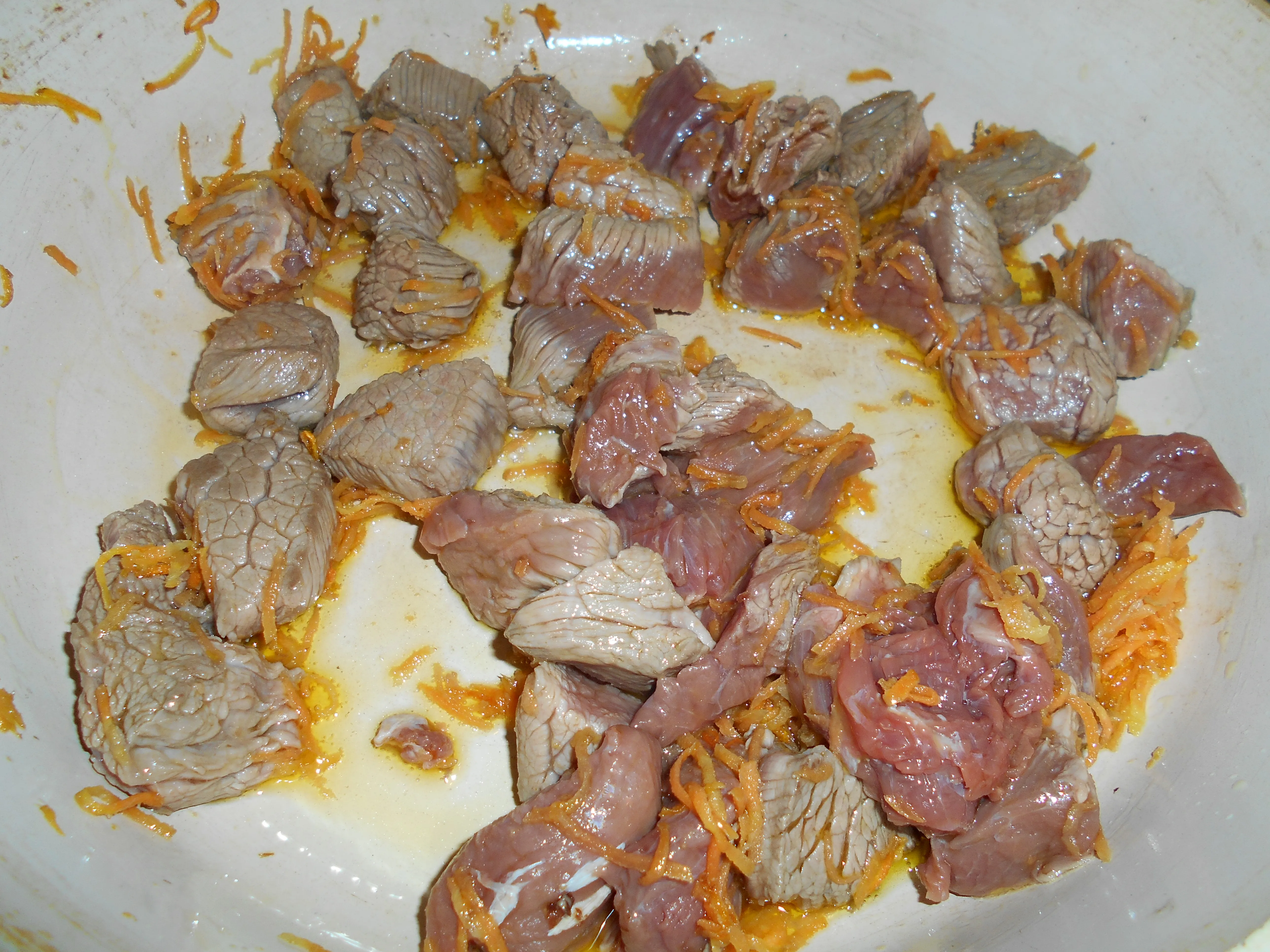 Одну морковь натрите на терке, обжарьте на растительном масле. Когда морковь станет мягкой, добавьте к ней кусочки говядины, обжаривая их со всех сторон до светлой корочки.