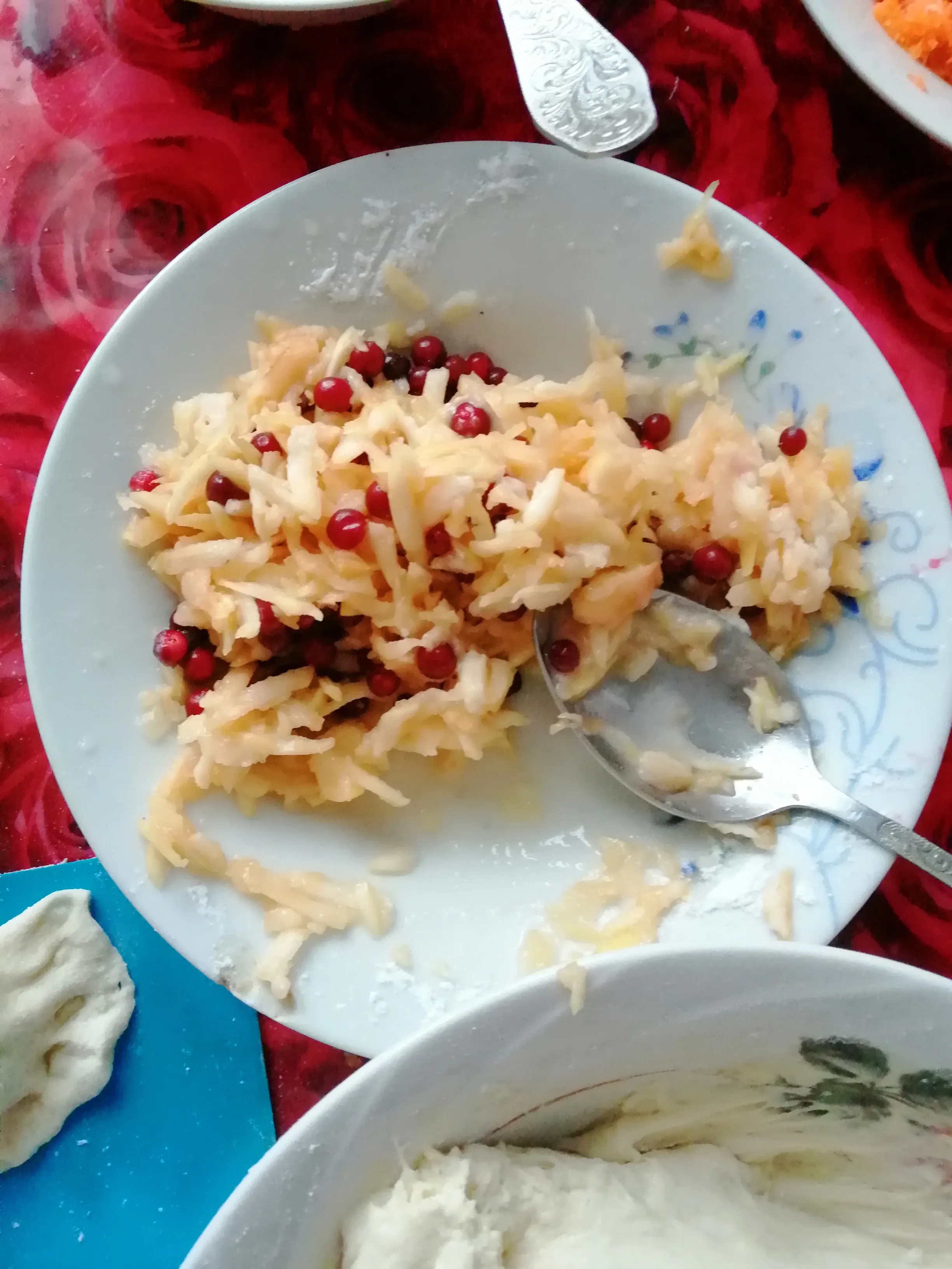 Приготовьте начинку. Натрите свежие яблоки на крупной терке, добавьте сахар и крахмал. Можно добавить брусники. Перемешайте.