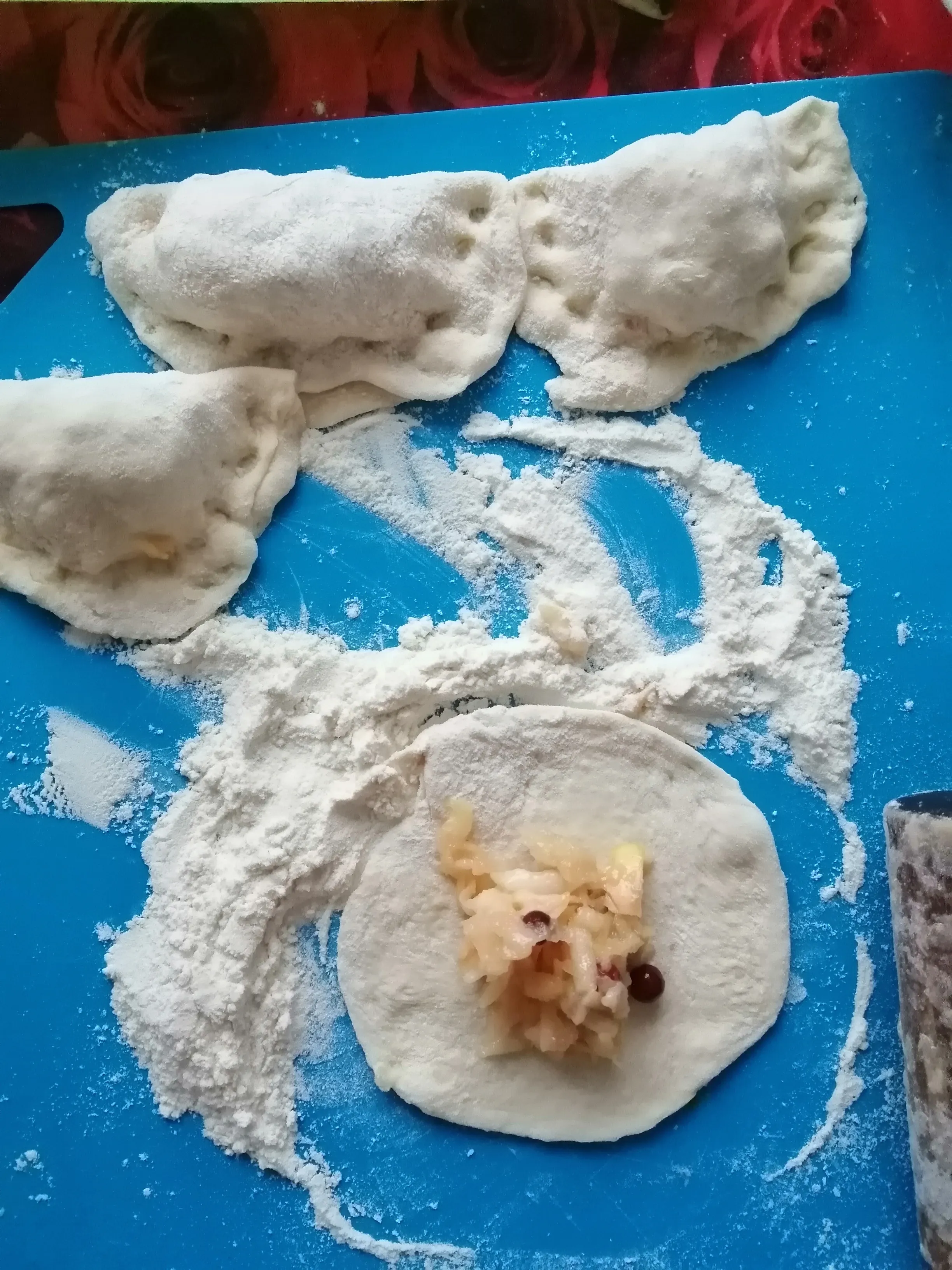 Раскатайте тесто на маленькие кружочки и положите начинку.