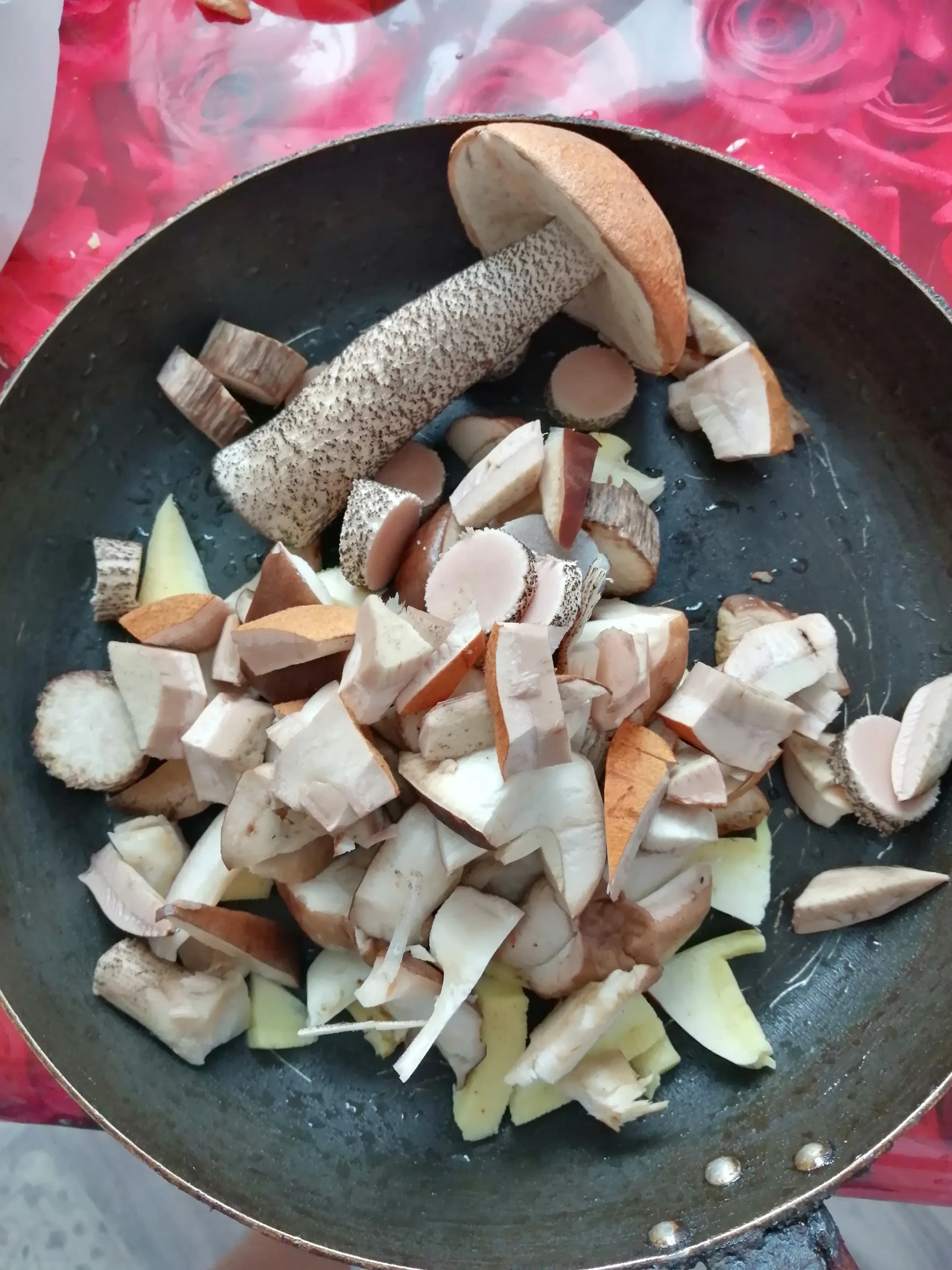 Нарежьте грибы, положите в сковороду. Залейте водой и варите 30-40 минут.