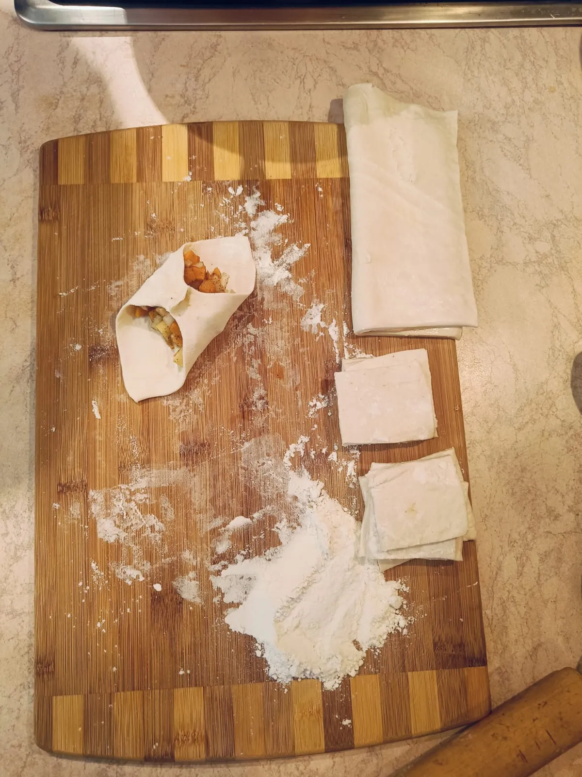 Нарежьте из теста одинаковые по размеру квадраты, раскатайте скалкой не сильно тонкие, чтобы не порвались, положите начинку и залепите по краям.