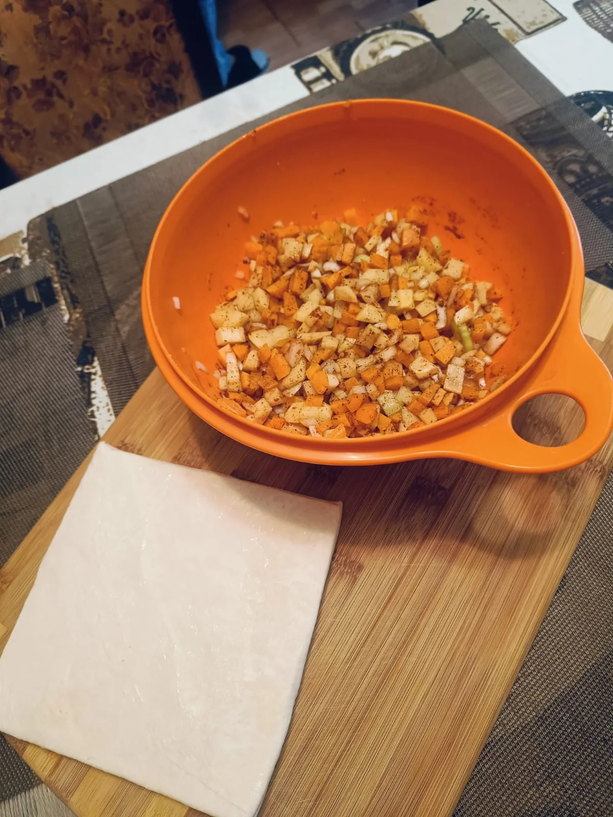 Тыкву и картофель нарежьте кубиками, добавьте мелко нарезанный лук, соль, перец, все перемешайте, тесто слоеное заранее разморозьте.