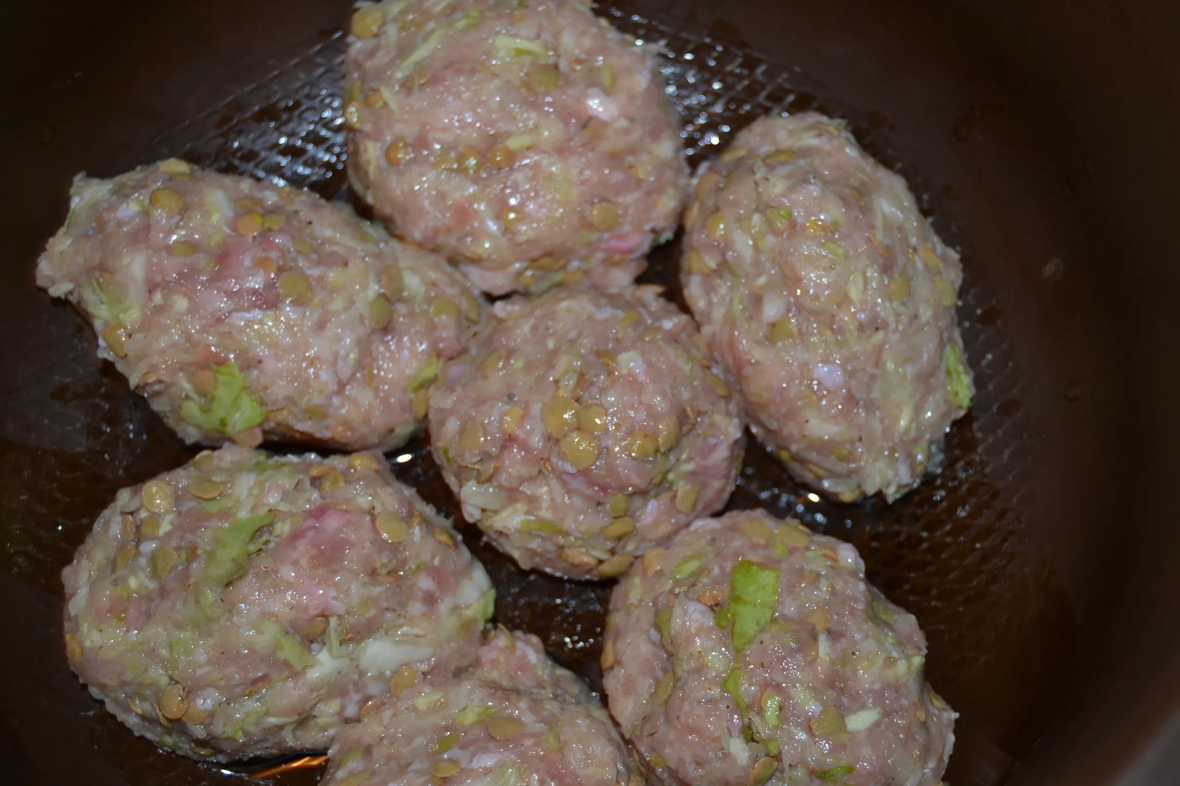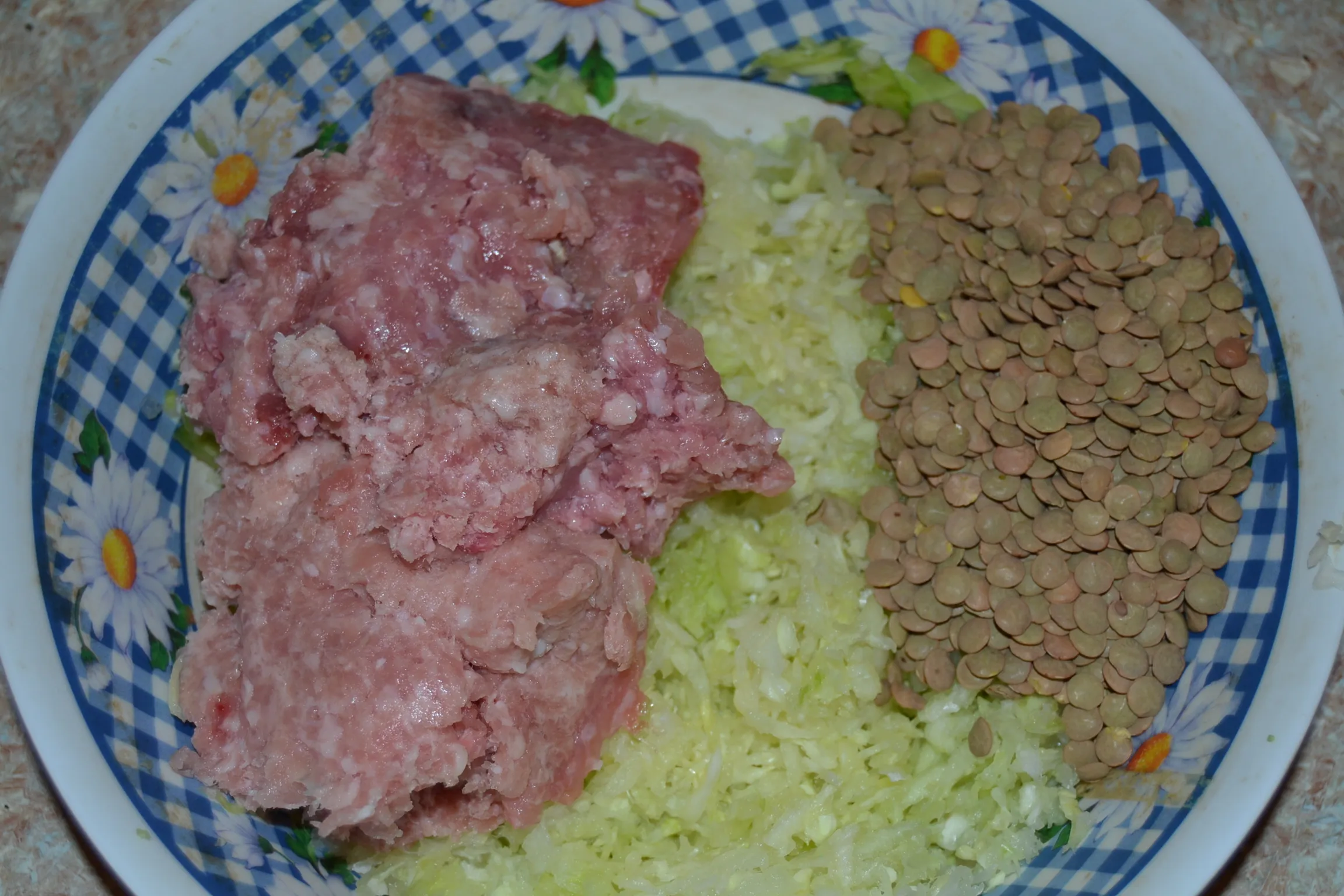 Смешайте фарш, капусту и чечевицу. Посолите по вкусу, добавьте любимые специи.