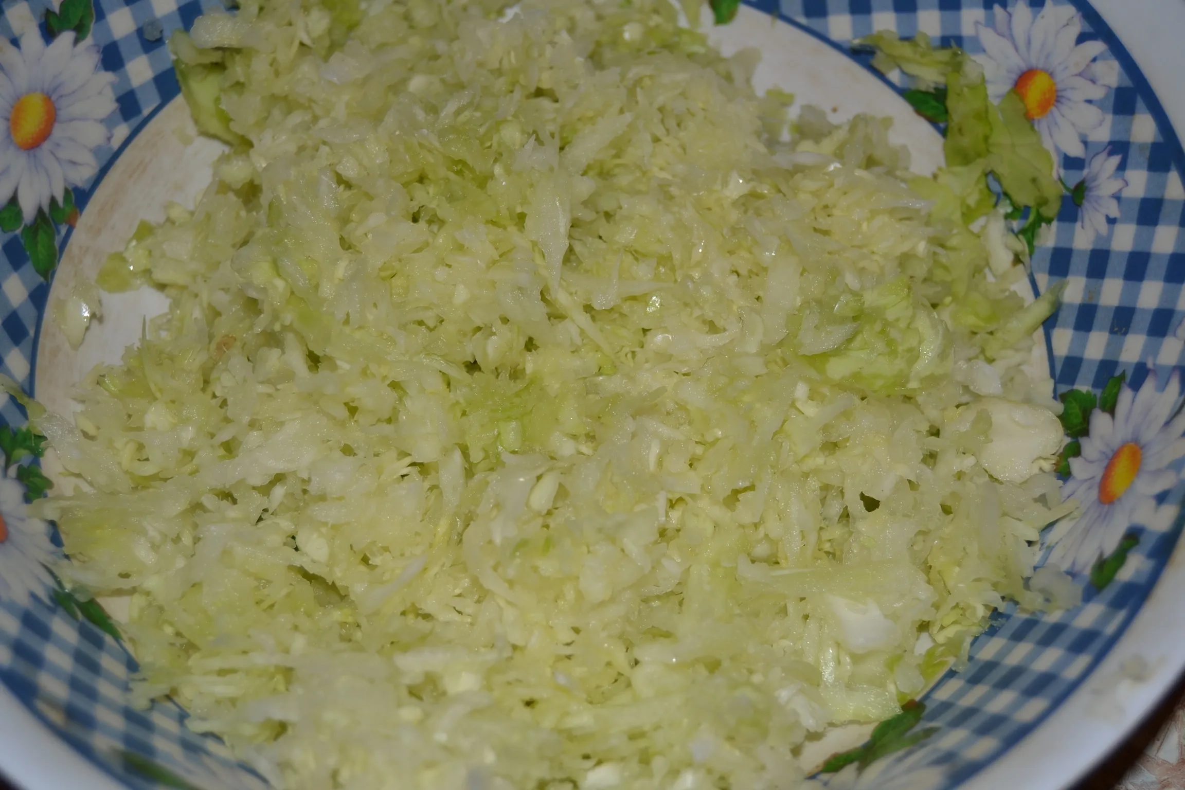 Капусту нашинкуйте. Можно воспользоваться кухонным комбайном или теркой.