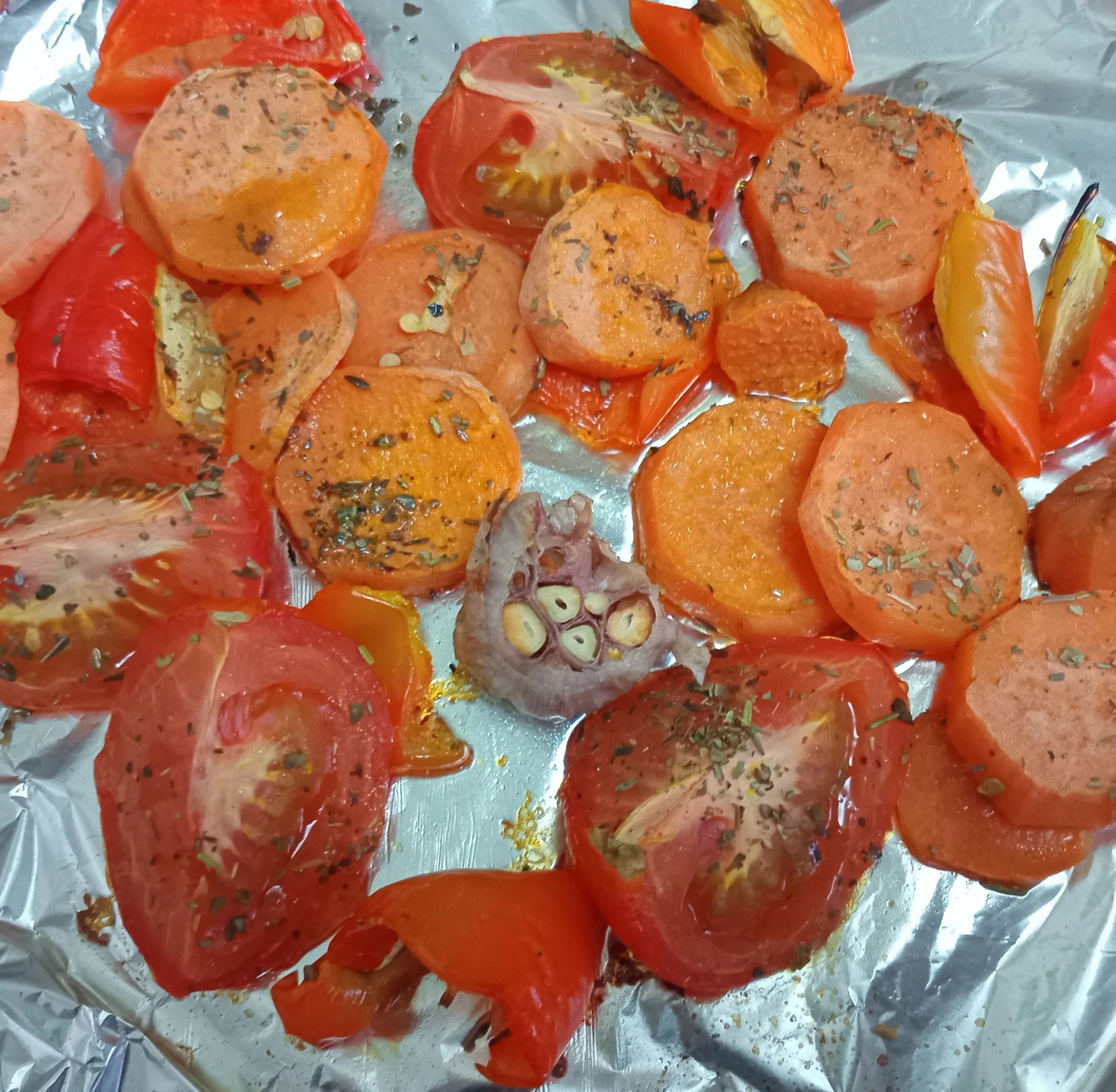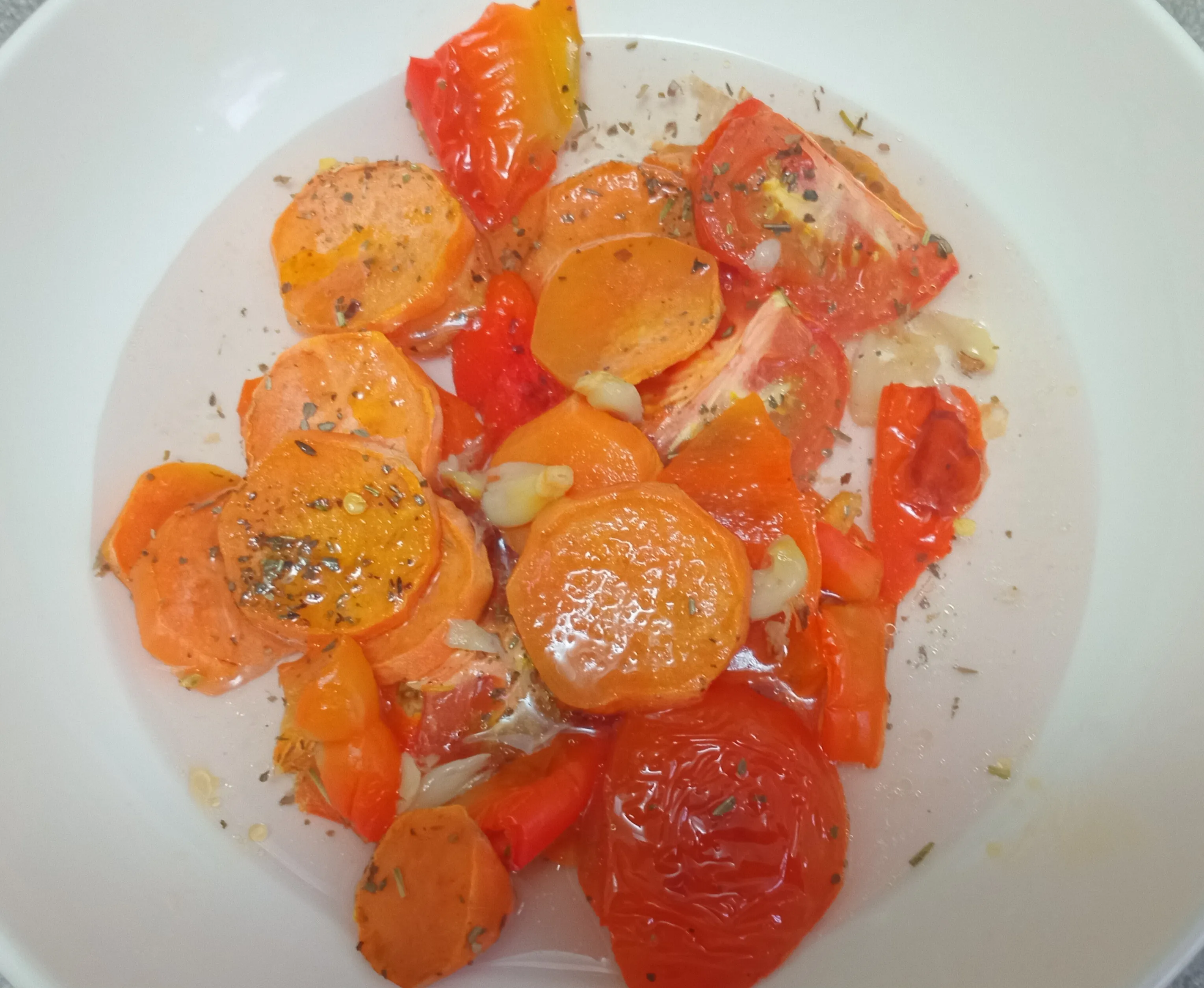 Выложите на противень нарезанные ломтиками помидоры, морковь и болгарский перец. Добавьте чеснок. Посыпьте прованскими травами и запеките в духовке при температуре 180 градусов 25 минут.