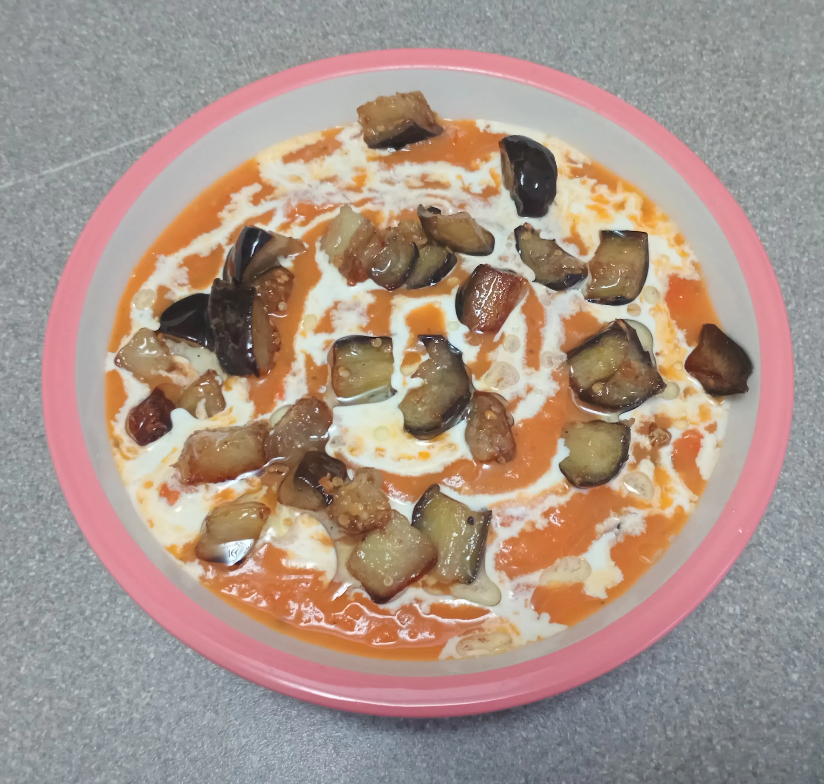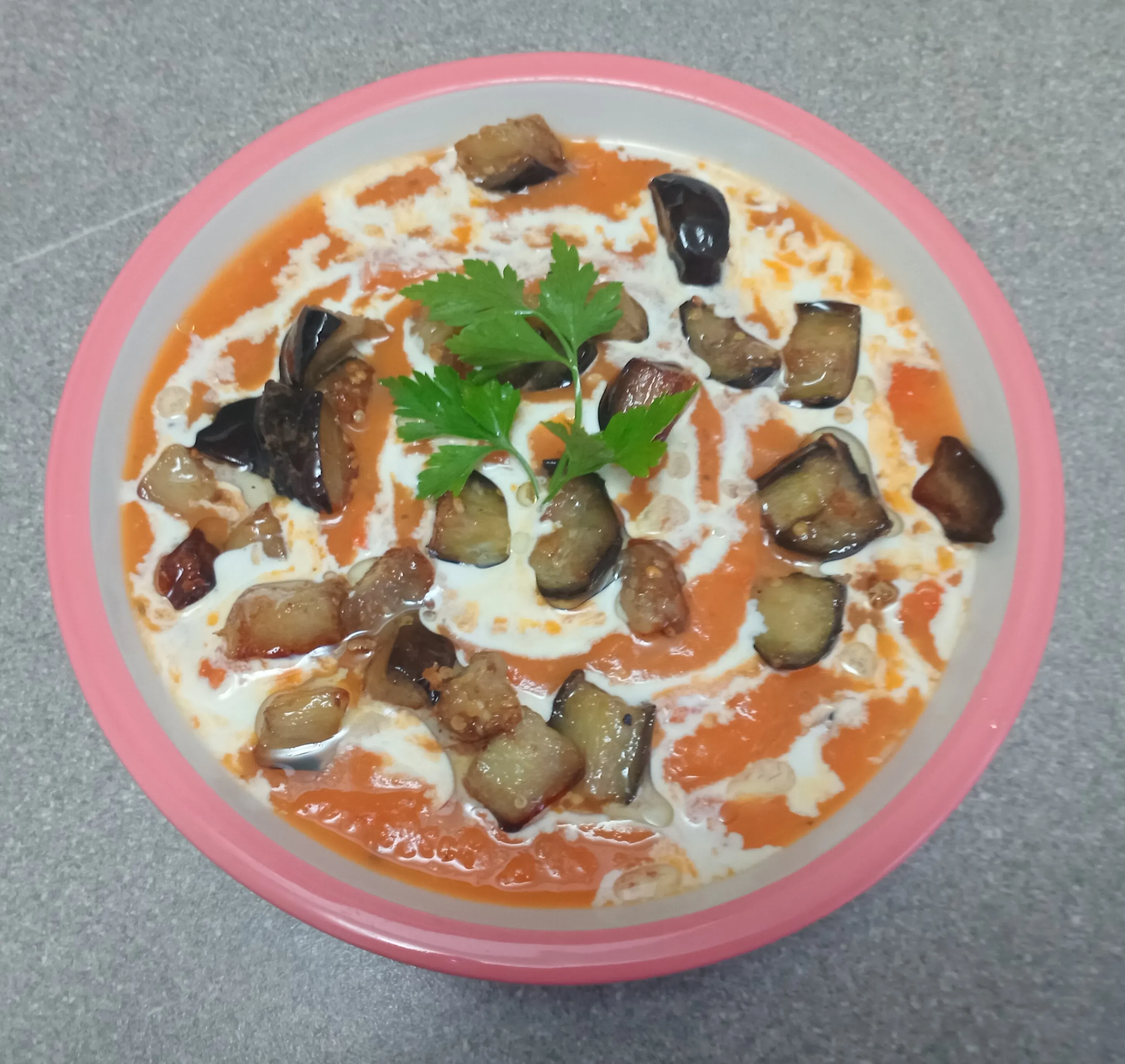 Баклажан нарежьте кубиками и обжарьте на растительном масле на среднем огне примерно 5 минут. Добавьте обжаренные баклажаны в суп. Подавайте, украсив веточкой петрушки.