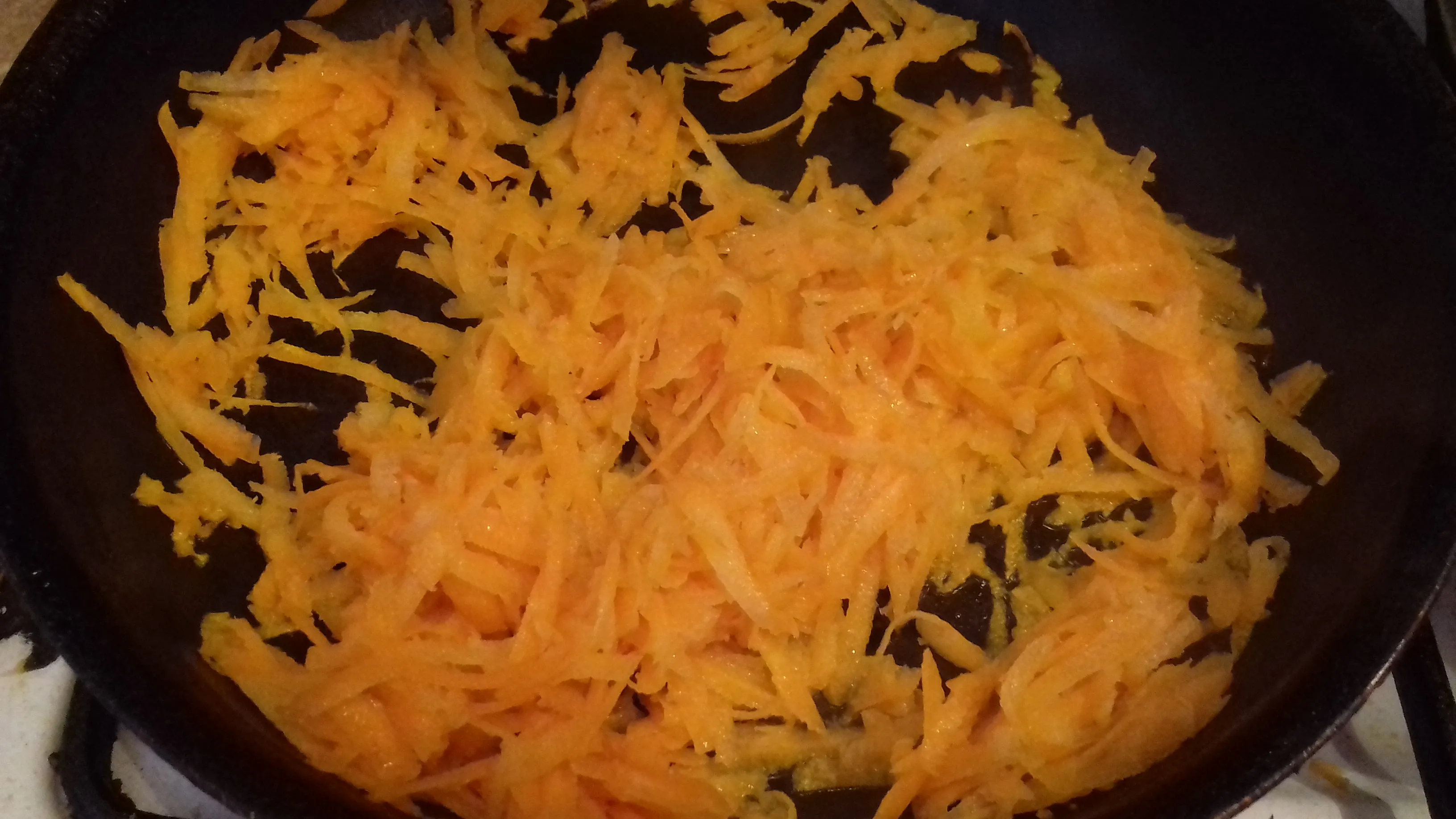 На растительном масле (1 ст.л.) обжарьте сначала морковь, затем добавьте к ней кабачок и тоже немного обжарьте.