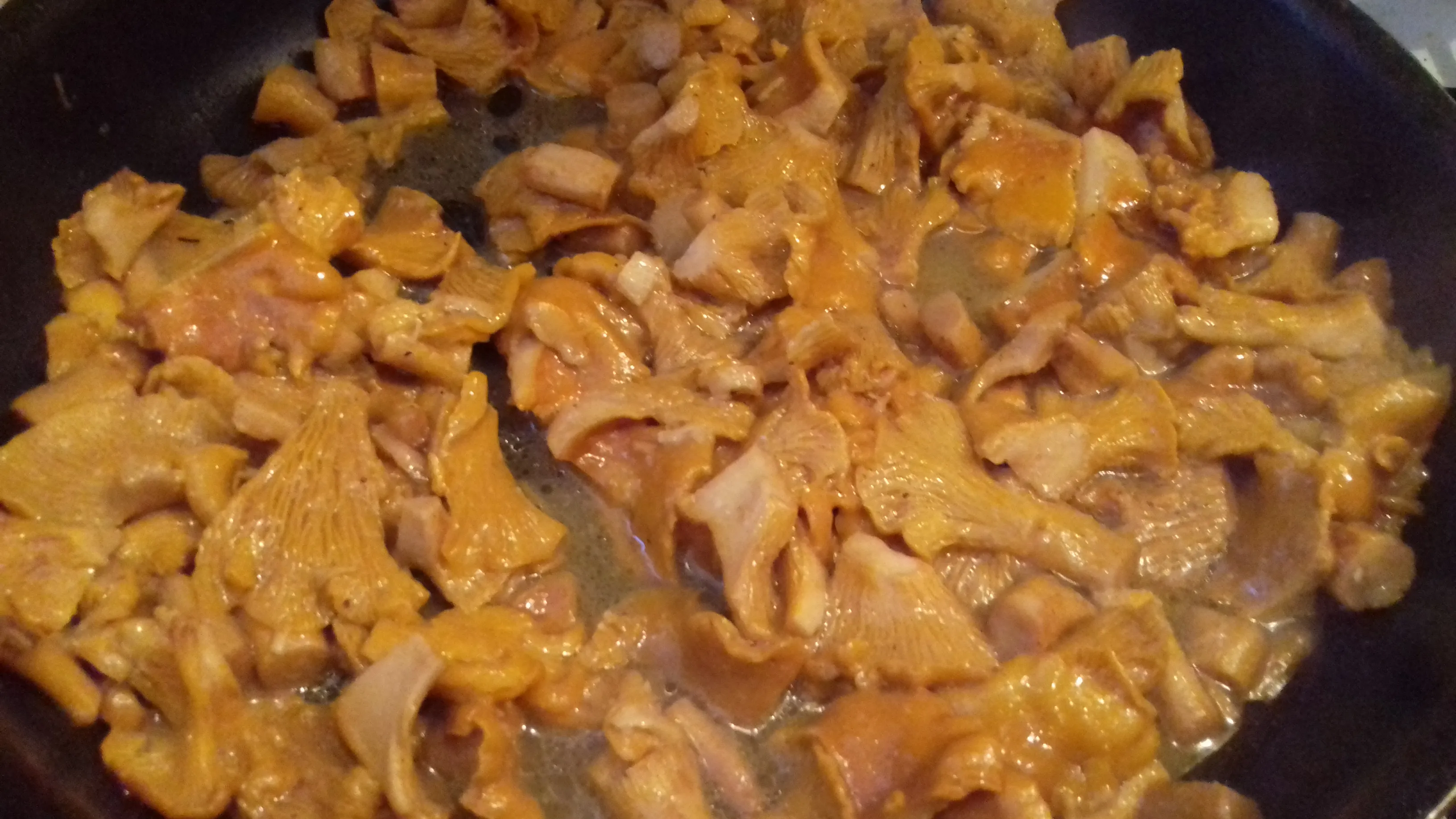 Лисички нарежьте на небольшие кусочки, обжарьте с добавлением растительного масла минут 15, посолите, поперчите по вкусу.