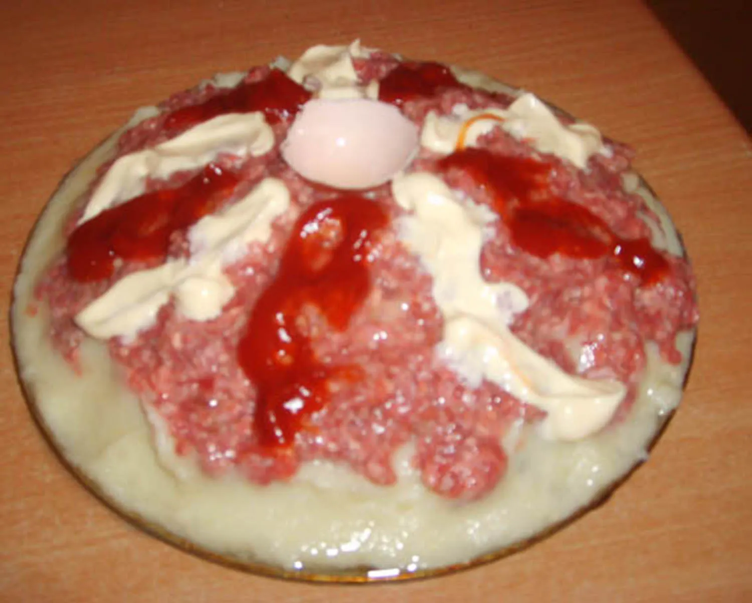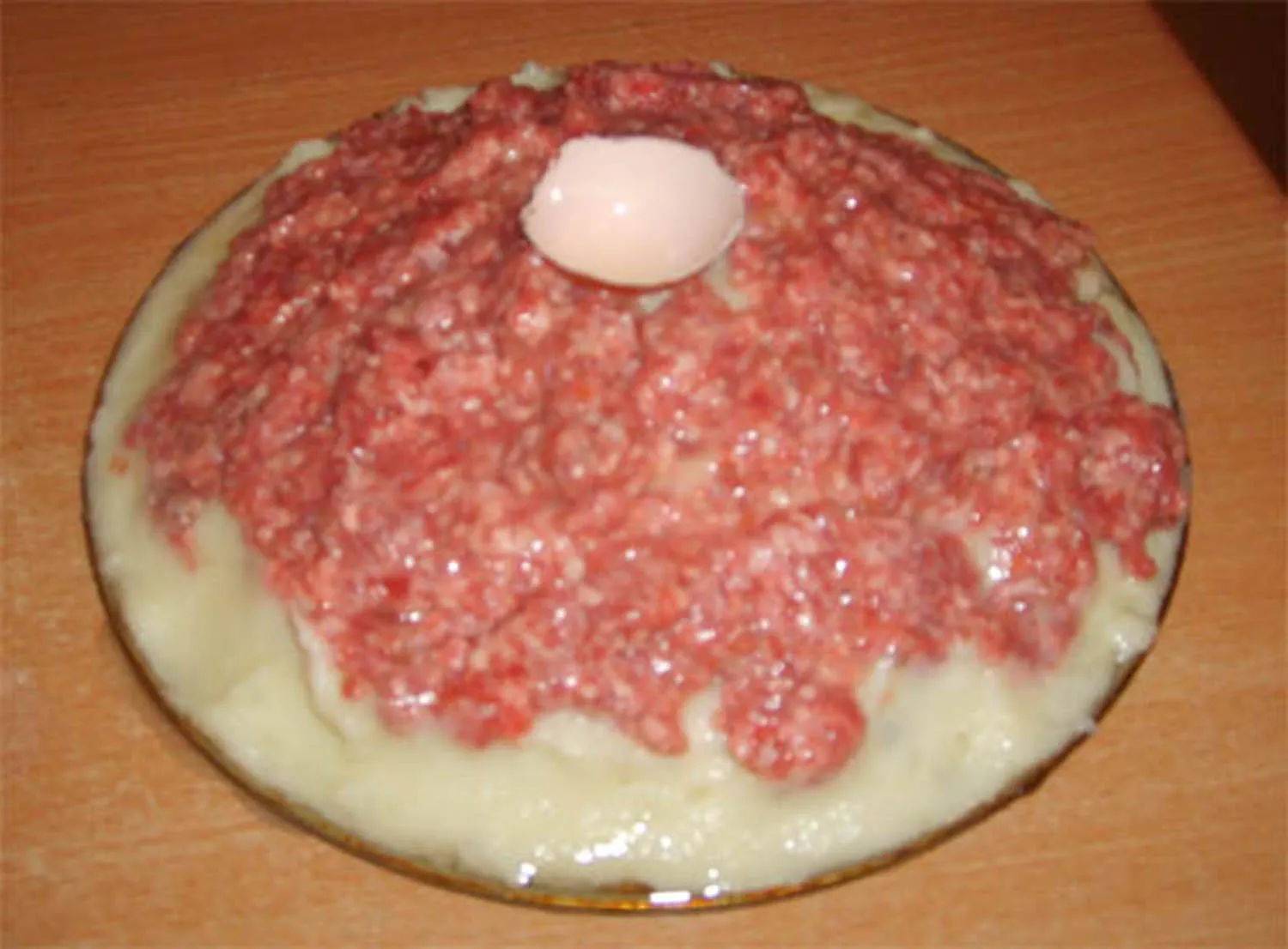 Сырой фарш распределите поверх пюре. В центр поставьте скорлупку половины яйца — она пригодится для эффектной подачи