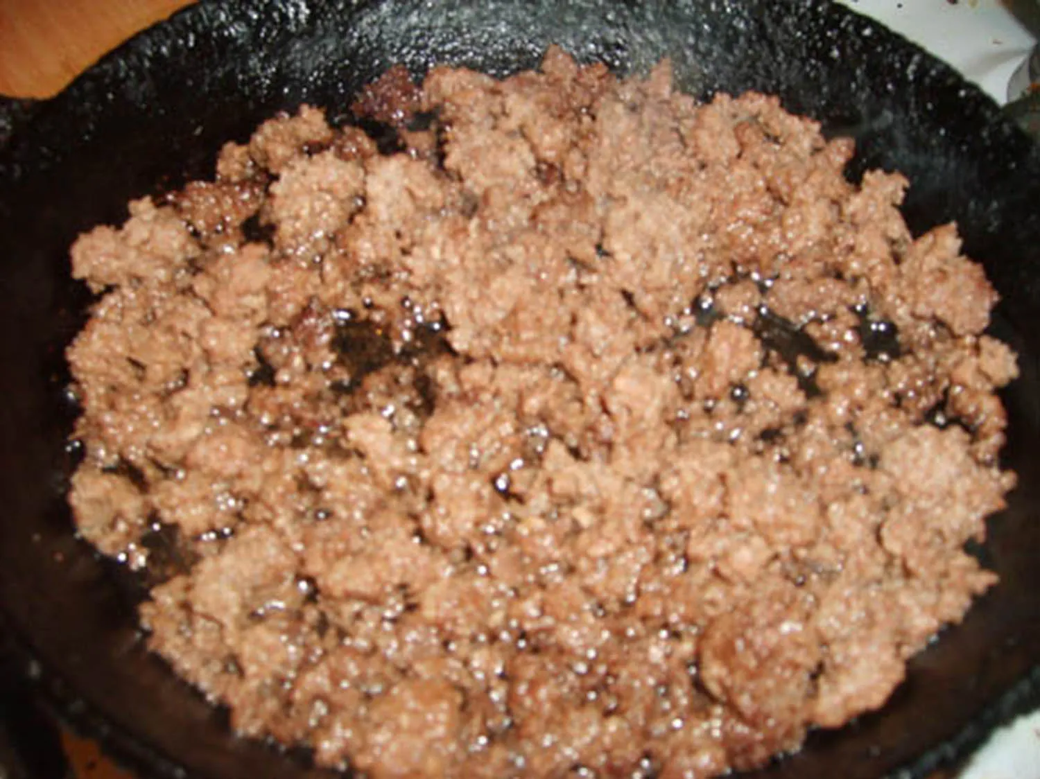 Фарш разделите на две части. Одну обжарьте до исчезновения красного цвета. Посолите, поперчите по вкусу.
