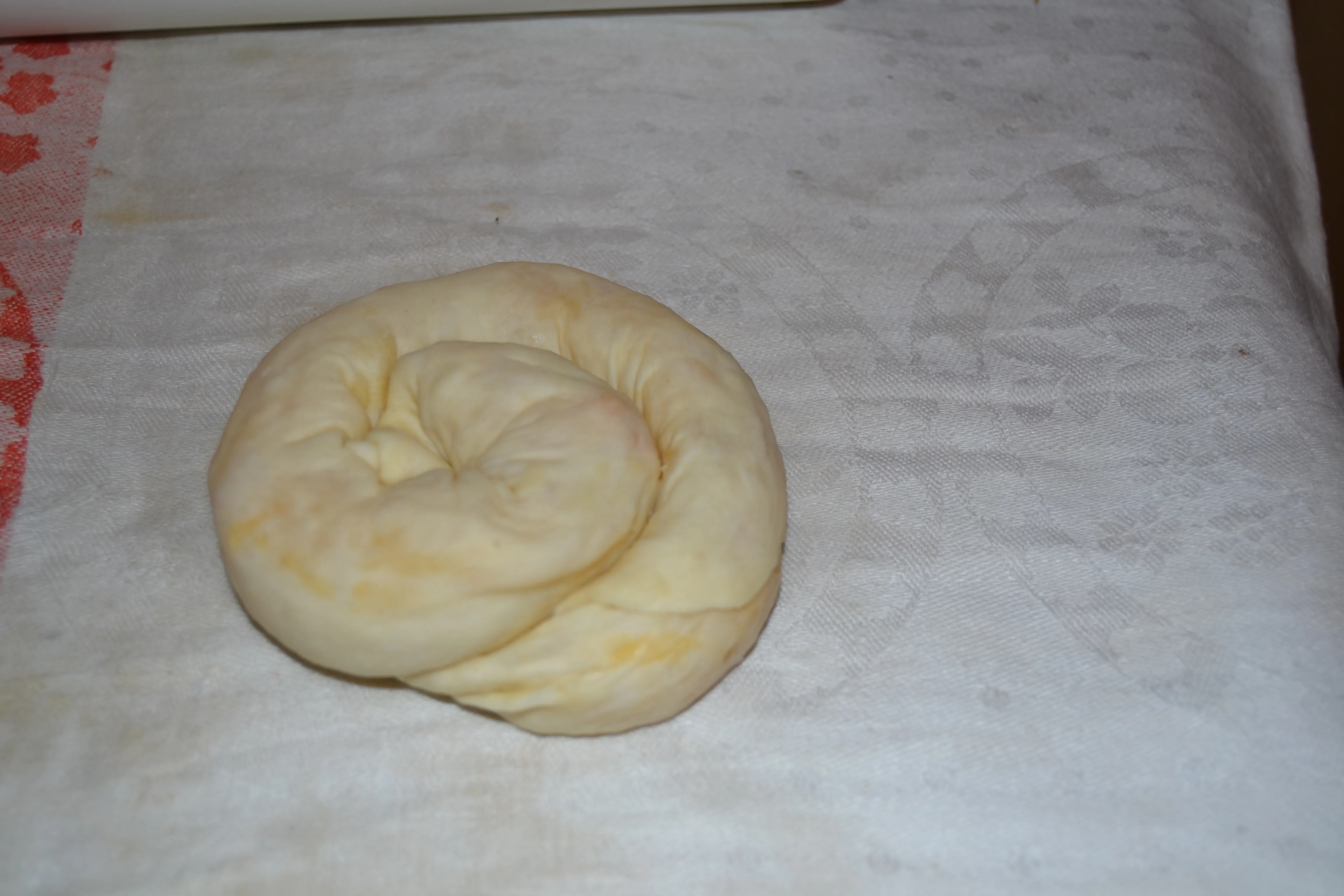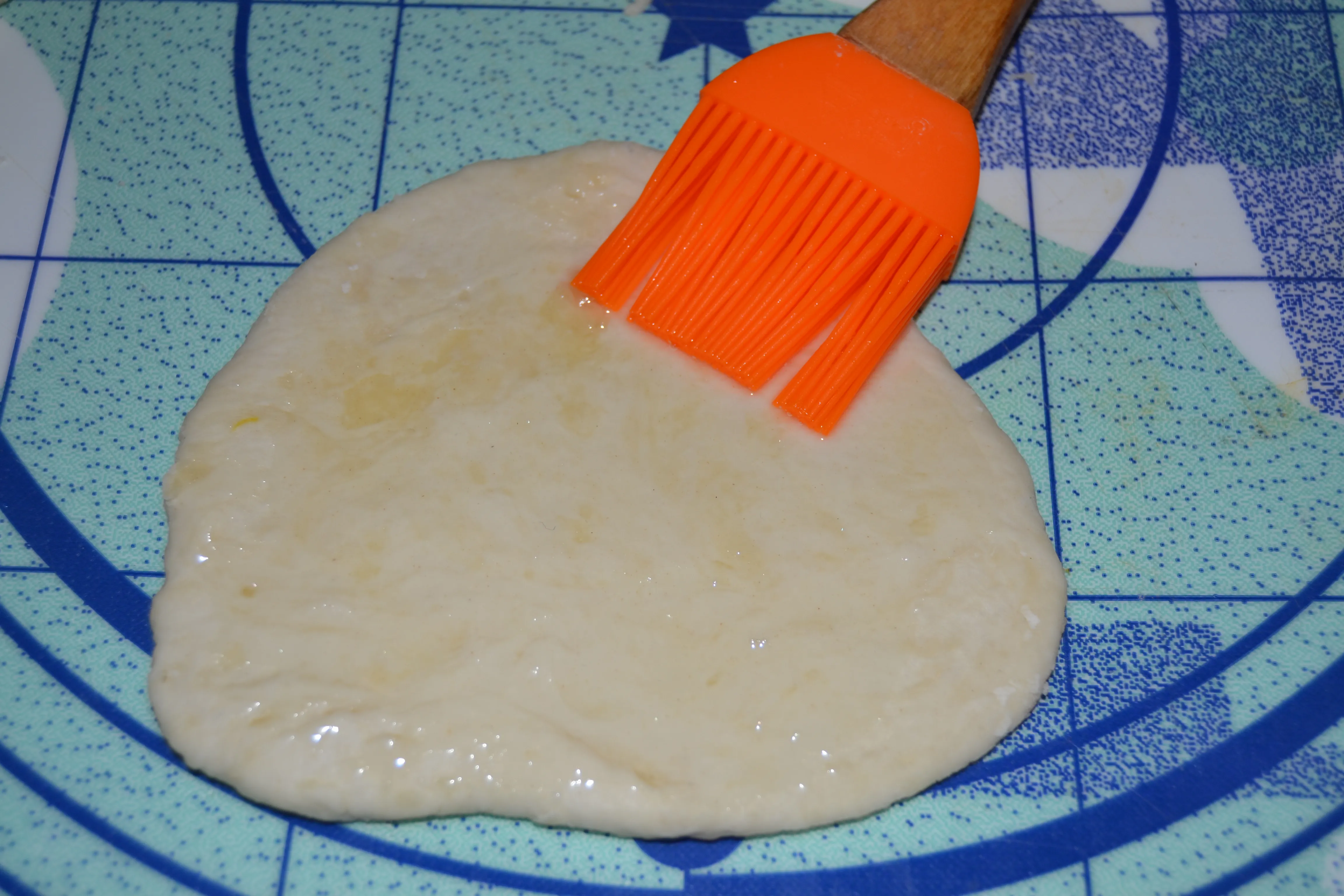 Тесто разделите на четыре части, каждую раскатайте в небольшую лепешку. Смажьте обильно растительным маслом, дайте немного пропитаться и растяните на руках от центра к краям.
