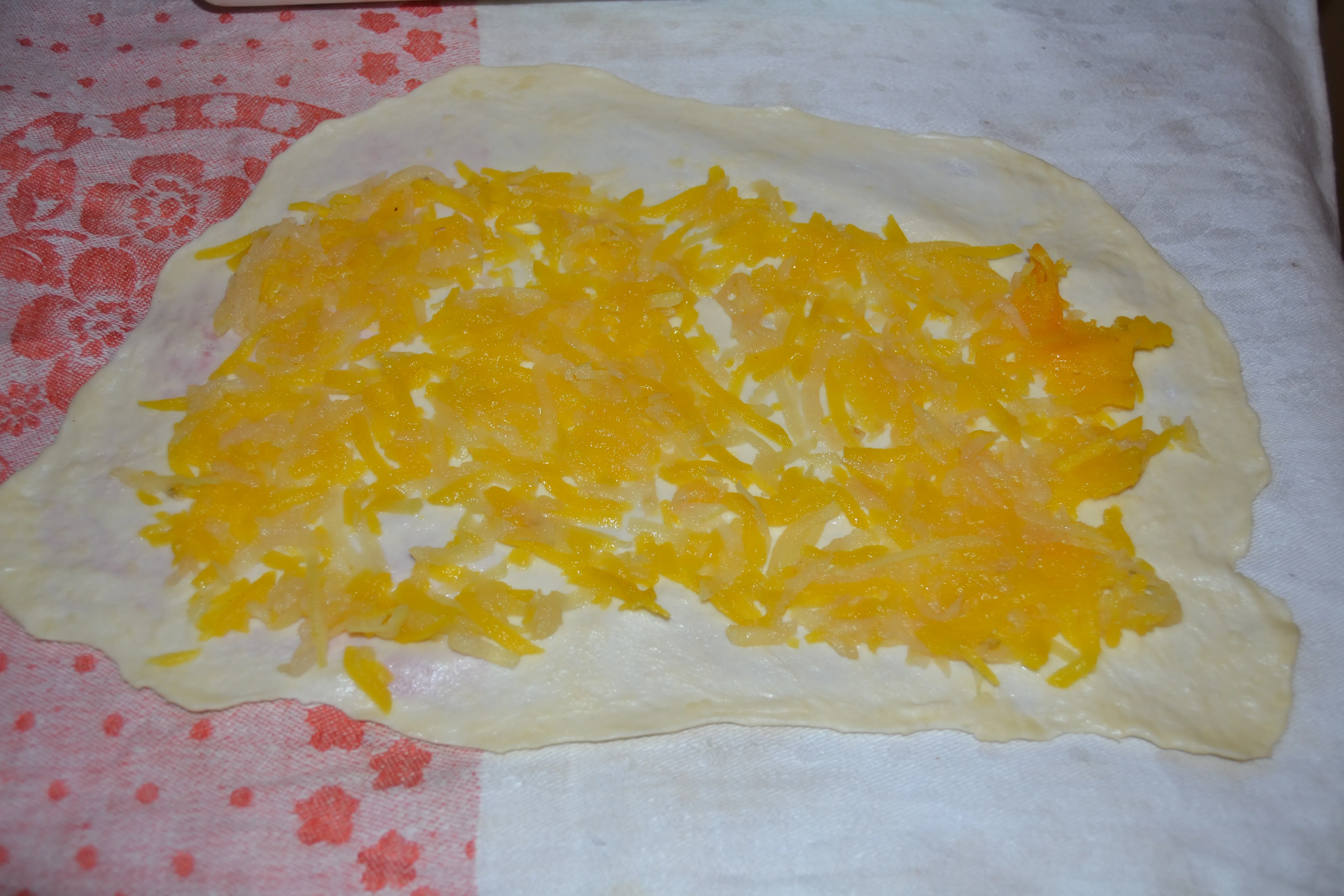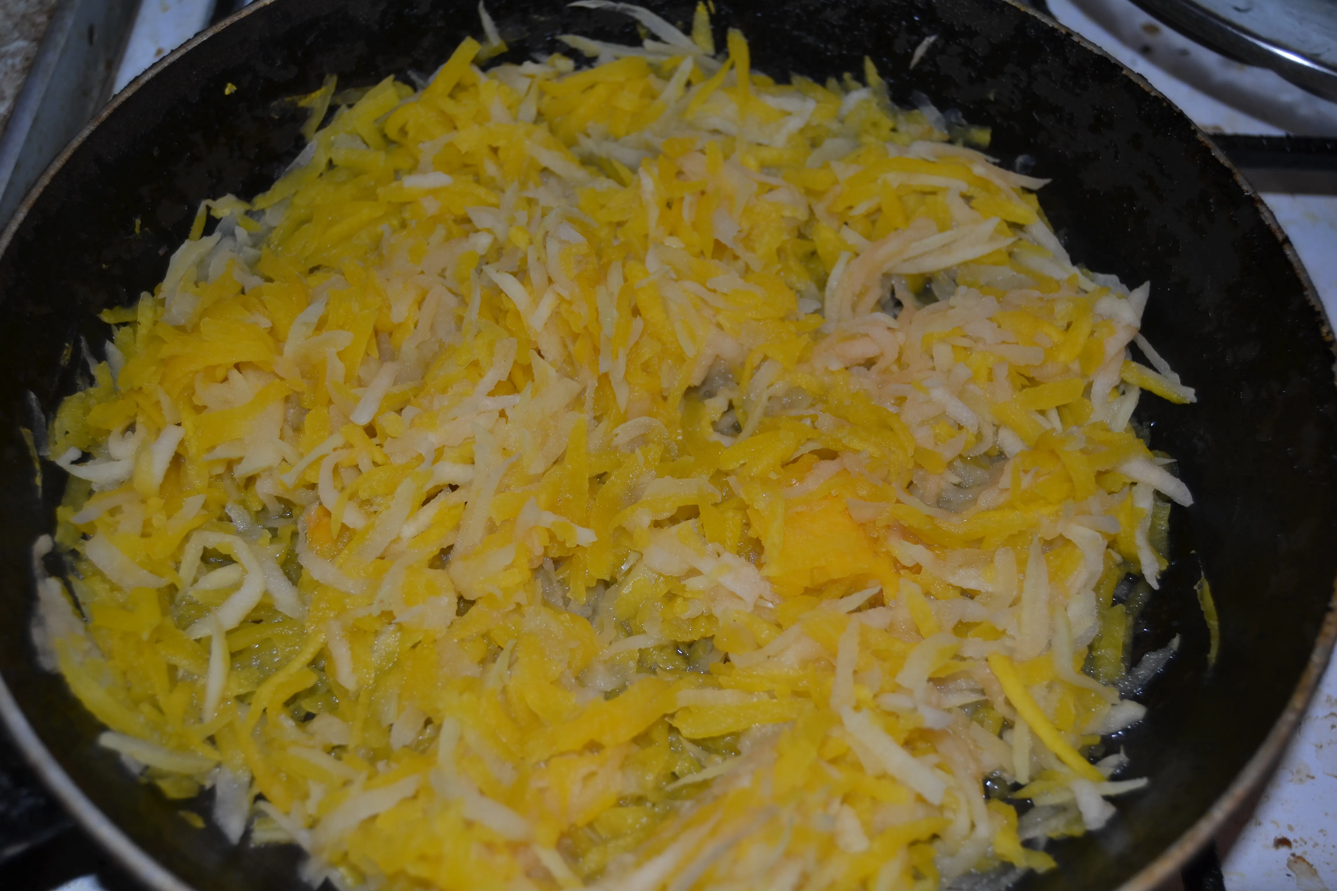 Для начинки натрите на тёрке тыкву и яблоко, добавьте немного воды и сахара. Тушите на сковороде до мягкости и впитывания жидкости. Дайте остыть.