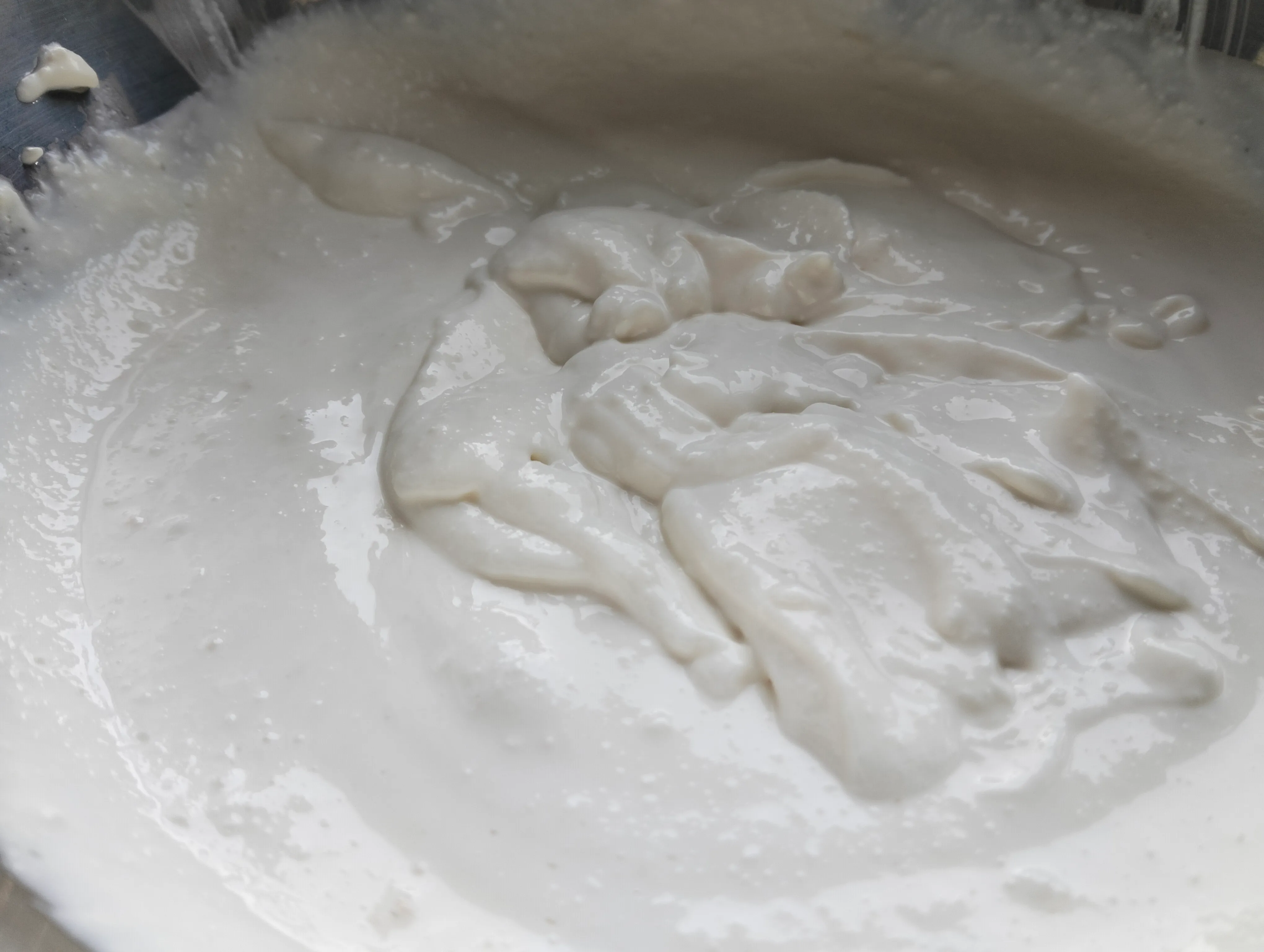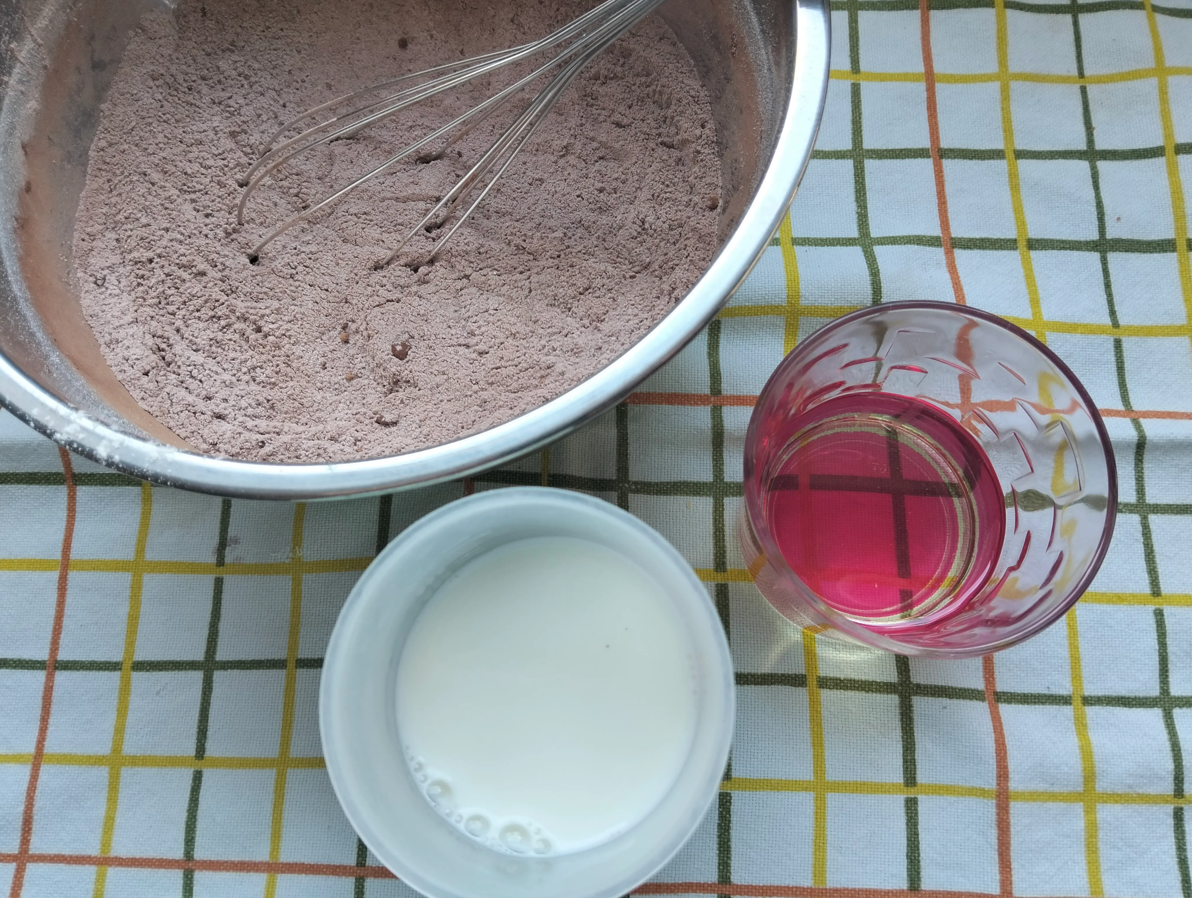 К сухой смеси добавьте теплое молоко и растительное масло.