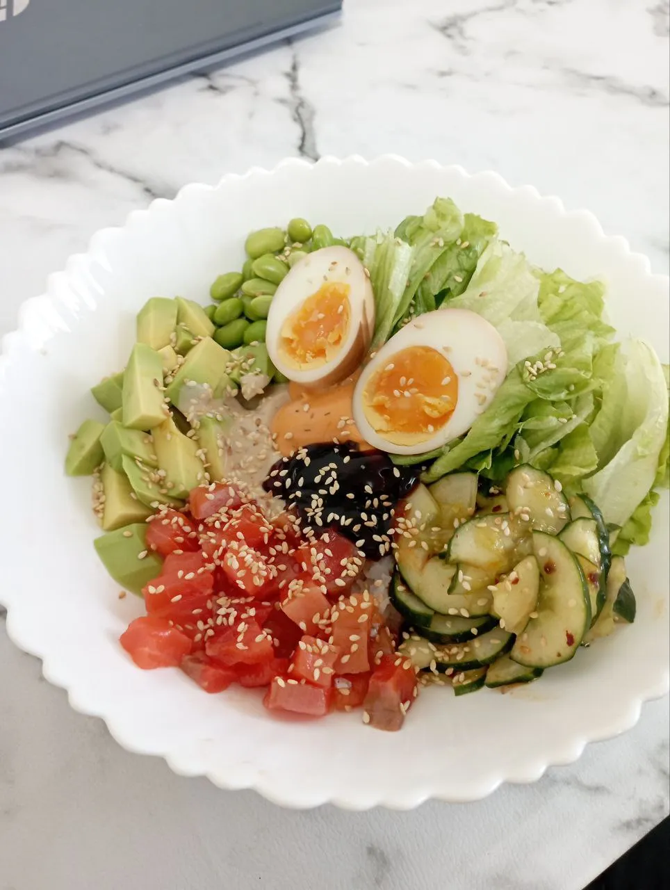 В большую порционную миску выложите сначала рис горкой, затем остальные ингредиенты по кругу. В центр добавьте соусы — спайси, кунжутный (можно также использовать устричный, ореховый, «Тысячу островов»), яйца и обжаренный кунжут.
