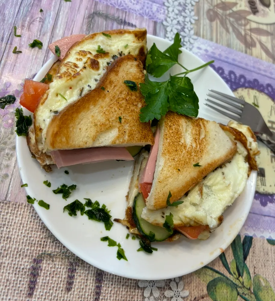 Сытный тост-сэндвич «Утреннее наслаждение» — это не просто яичница с хлебом, а настоящий слоеный шедевр в хрустящей яичной глазури. Нежный омлет, расплавленный сыр, сочные овощи и ароматная ветчина — идеальное начало дня.