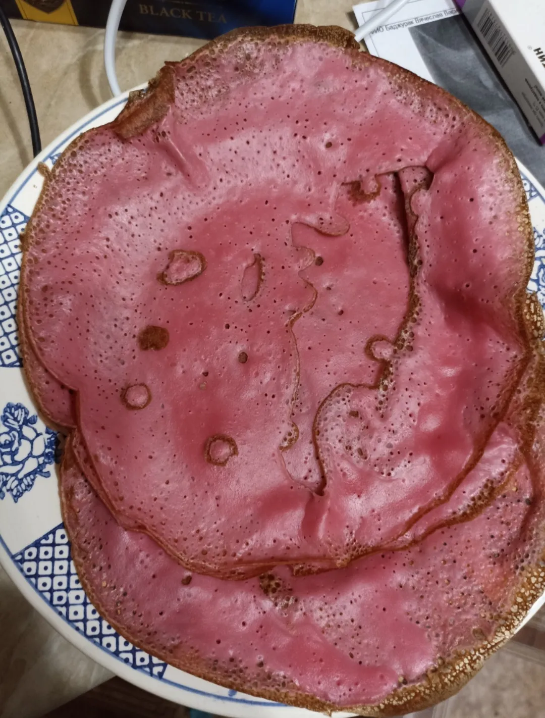 Для цветных блинов добавьте натуральный свекольный сок, можно использовать сок моркови, тогда они будут жёлтые.
