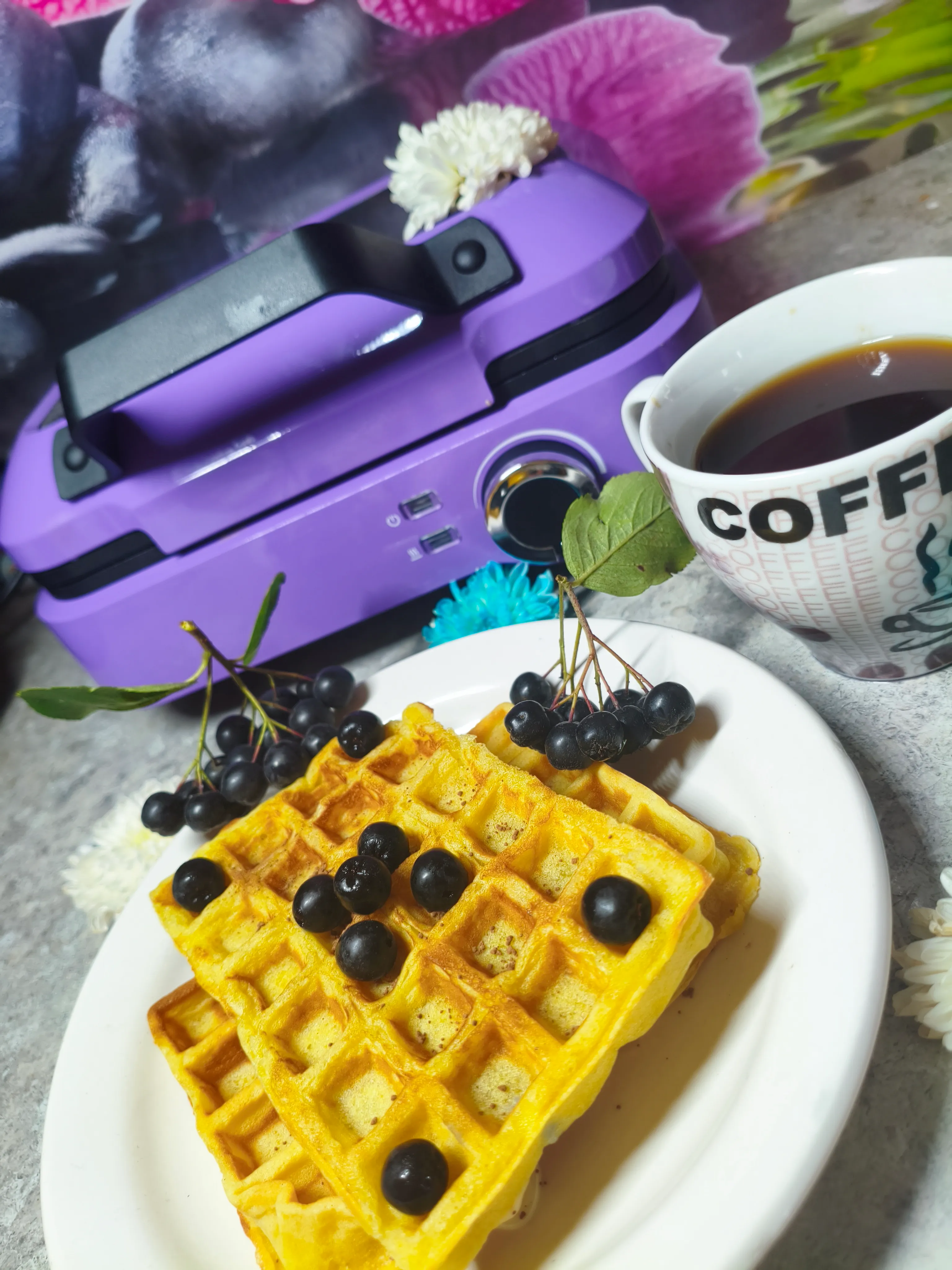 Разогрейте вафельницу, выложите по 2 столовых ложки теста на каждую секцию. Выпекайте вафли 4-5 минут до золотистого цвета.