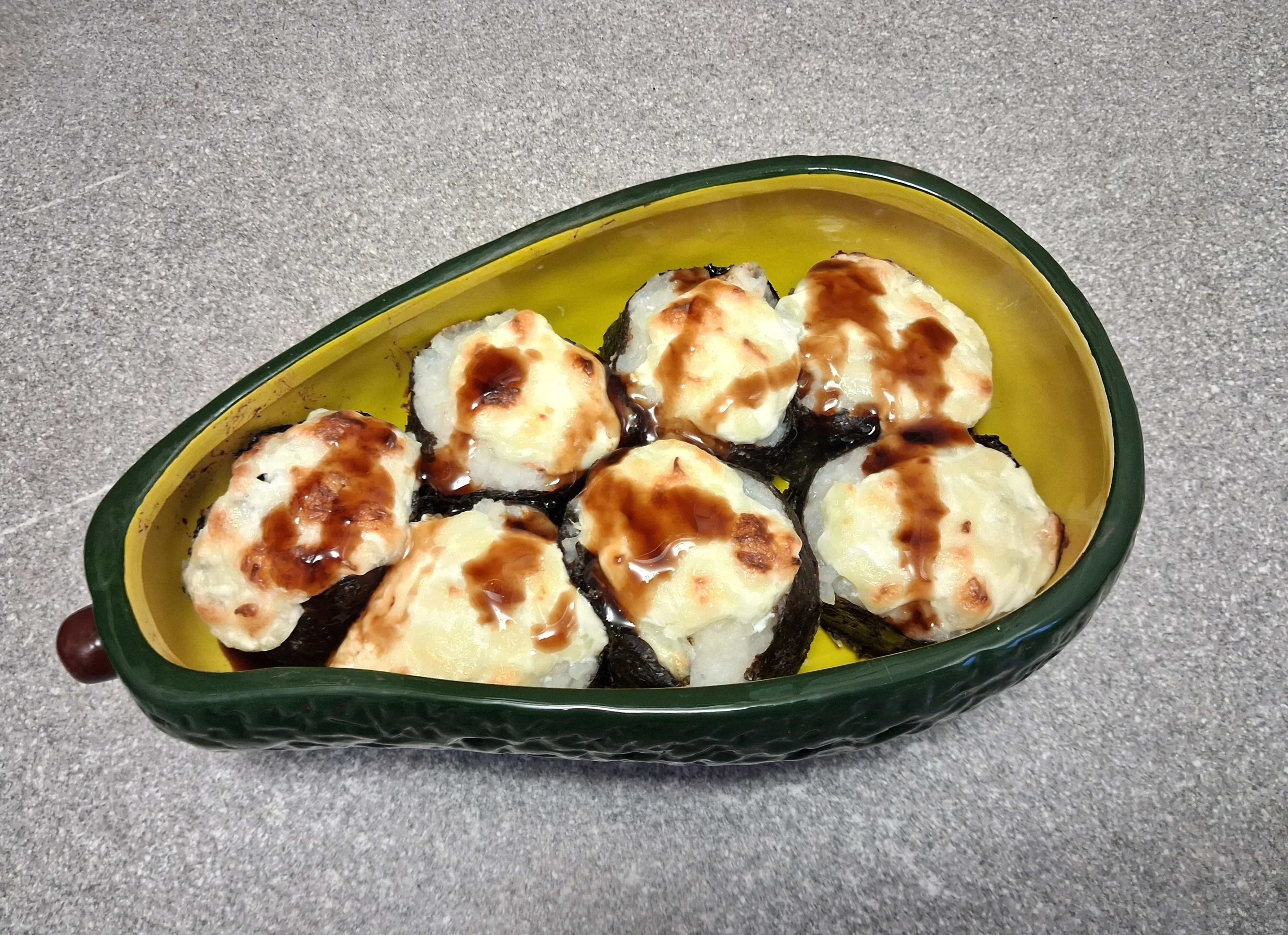 Подавайте роллы, полив соусом терияки. По желанию можно посыпать кунжутом.
